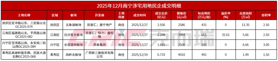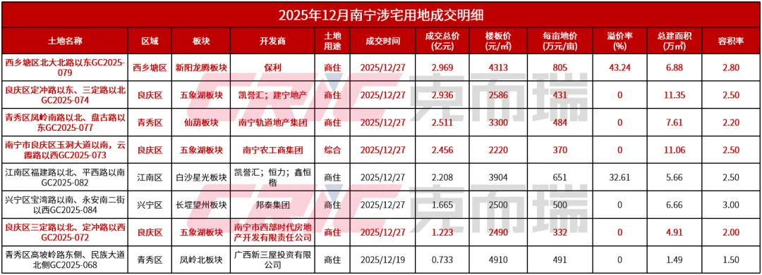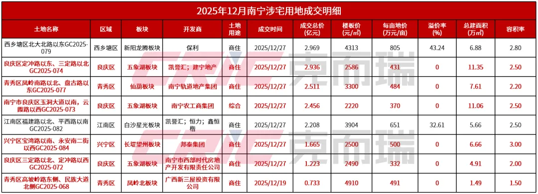 翻看2025 年 12 月南宁的土拍成绩单,“底价成交” 是出现频率最高的关键词,无论是国企托底拿下的良庆区地块,还是本土民企竞得的老城区旧改项目,绝大多数地块均以起拍价成交,溢价率极低,甚至鲜有超过 5% 的溢价地块,这一特征与此前土地市场火热时高溢价、抢地的场景形成了鲜明对比。