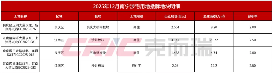 尽管2025 年 12 月 27 日的集中出让取得了不错的成绩,实现了成交规模的爆发式增长,但整个 12 月的南宁土地市场并非一片坦途,撤牌现象依然存在,成为市场发展中难以忽视的问题。在此之前,江南区、良庆区均有多宗地块因故终止出让,这说明并非所有地块都能顺利找到买家,南宁土地市场的供应端依然面临着较大的压力。