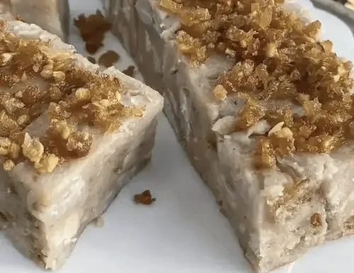 选用荔浦芋头,去皮切小丁,加入粘米粉、少量白糖和清水,搅拌成浓稠的糊状,倒入模具中蒸熟。放凉后切成小块,放入铁锅用猪油慢煎,煎至两面金黄酥脆,外皮起沙,内里软糯。