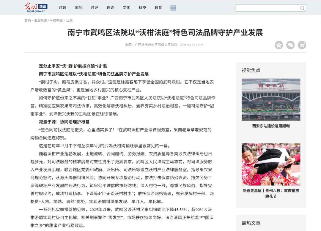 要让法治声音既传得远、更听得懂,就要让法律走出法庭、扎根乡土、沾着果香。武鸣区人民法院立足本地民族地域特点,运用壮汉双语开展庭审直播、典型案例深度解读,单场直播最高观看量突破100万人次;在官方微信平台深耕“阿锤说法”“武法漫谈”“小案大道理”等特色专栏,将鲜活案例推送到群众指尖,让普法融入日常;深挖骆越文化底蕴,将法治思想融入地方文脉,法院干警亮相《今日说法》“走进一线法官”融媒体节目,联合最高人民法院、新华社精心拍摄《中国法院“二十四节气”——大暑・北回归线上的“沃柑法庭”》《这家法庭有点甜》《柑甜》等普法短片,让司法为民的故事伴着沃柑清香飘入千家万户,为“武鸣沃柑”品牌擦亮法治底色。