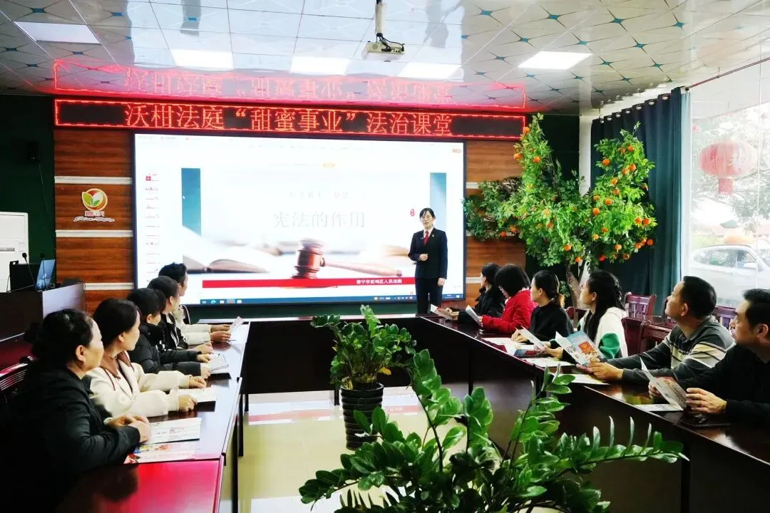 武鸣区人民法院将普法阵地前移至沃柑产业链的最前沿,联合城区党委组织部打造“武鸣红云·e法庭”,把党员干部、人民调解员等基层社会治理主力军培育成“法治种子”,让一批批乡村“法律明白人”在果园里、村屯间扎根,成为群众身边“搬不走”的解纷力量。