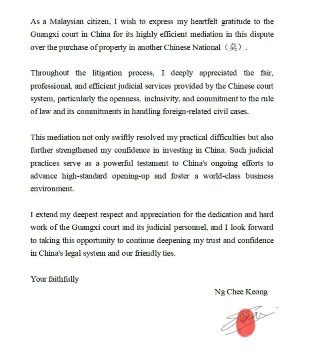 参与调解的马来西亚籍调解员陈俐璇表示,此次调解让她切身感受到中国法院在线调解模式的高效、便捷与低成本,充分展现中国法院在涉外纠纷化解领域的专业能力与创新实践。同时她还结合本案情况,向各方释明了外籍人士在马来西亚借名买房的潜在法律风险,提示该行为虽未被当地法律明文禁止,但在当地司法实践中并不被提倡。