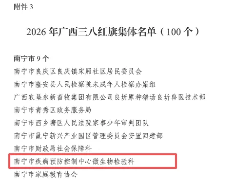 近日,自治区妇联印发《关于表彰2026年广西三八红旗手标兵、广西三八红旗手、广西三八红旗集体的决定》,南宁市疾病预防控制中心微生物检验科榜上有名,被授予 “广西三八红旗集体” 荣誉称号!