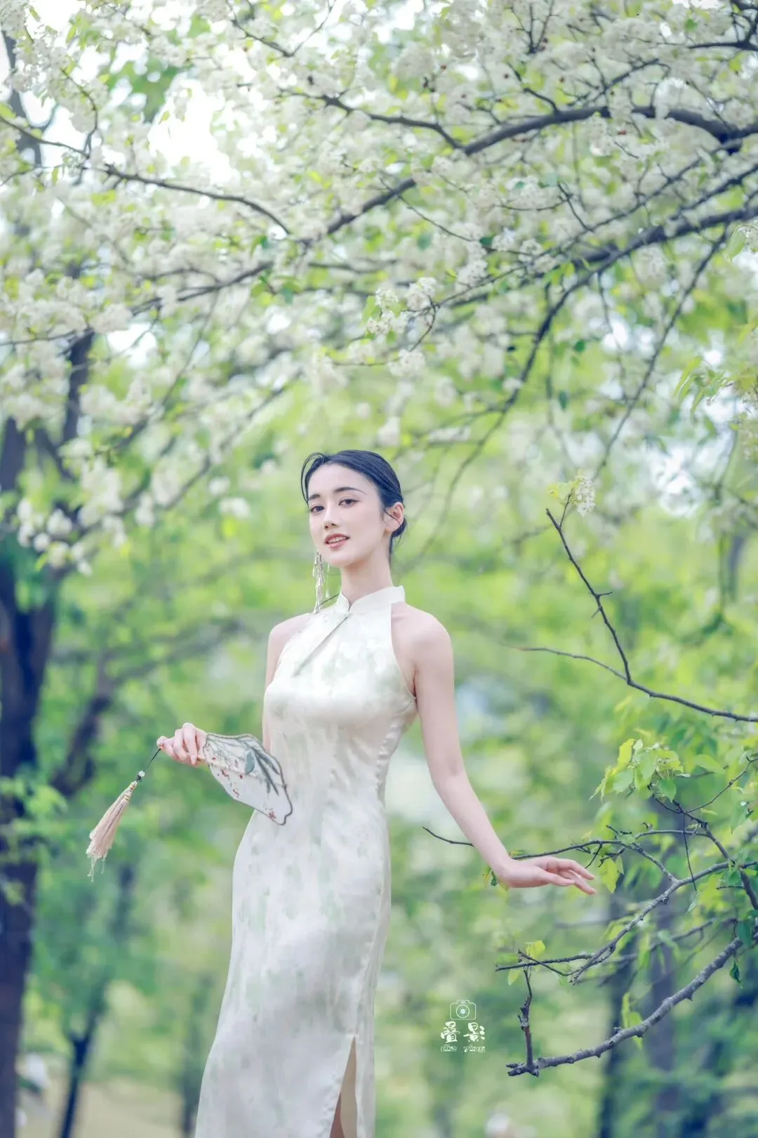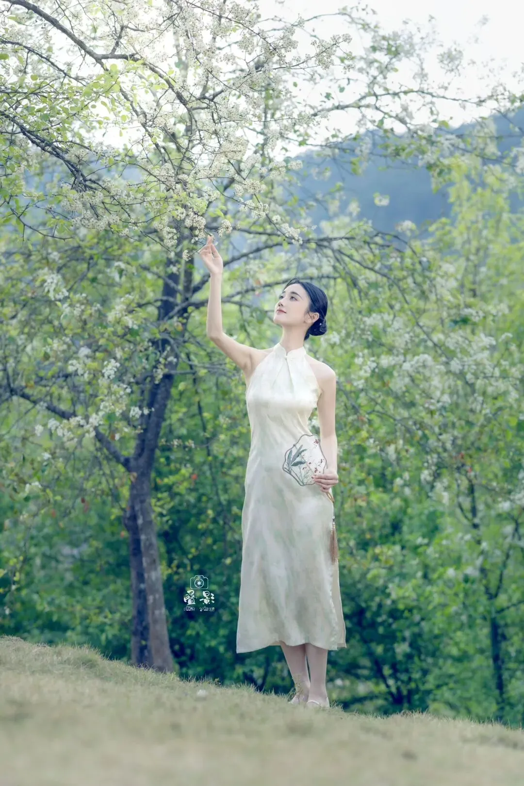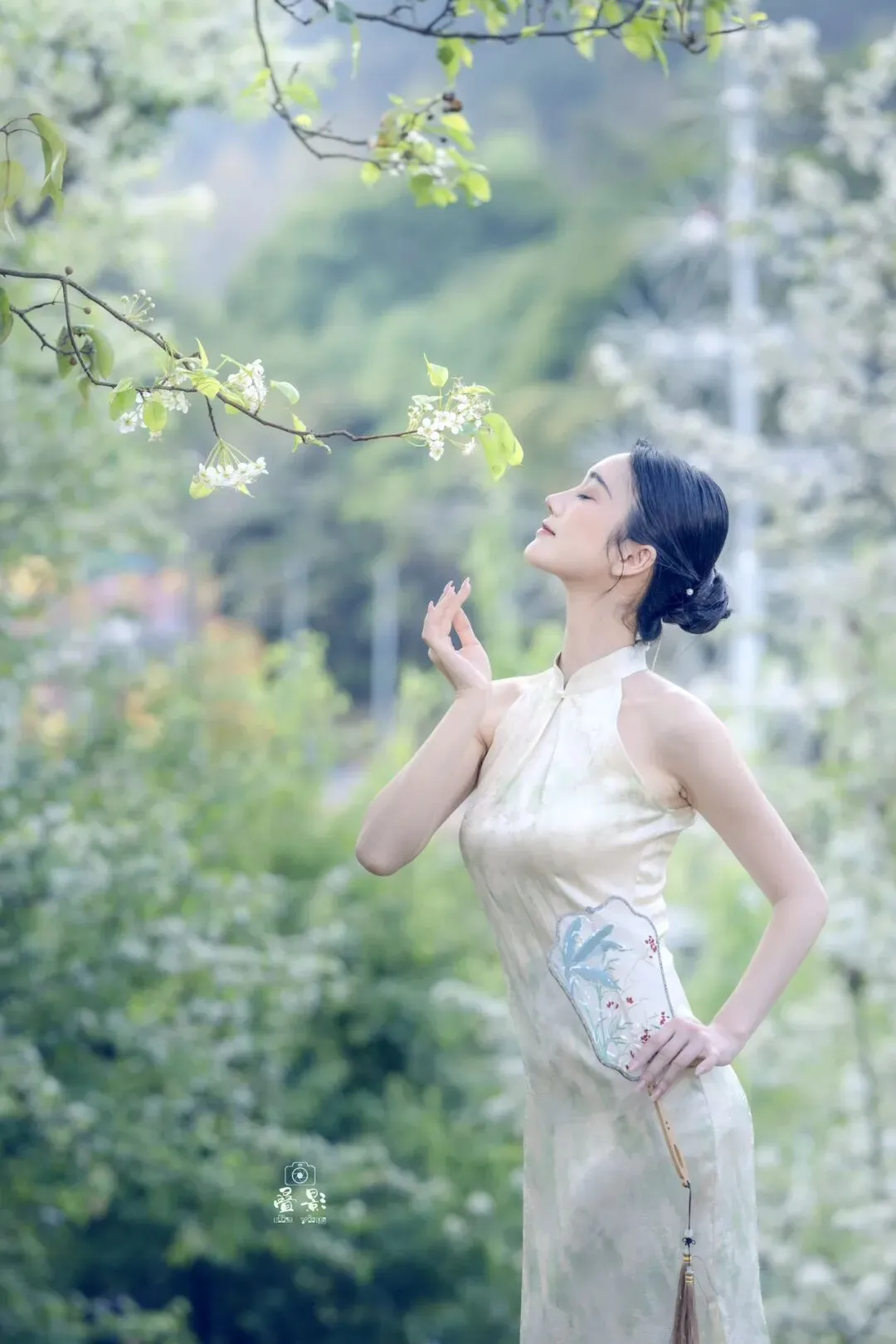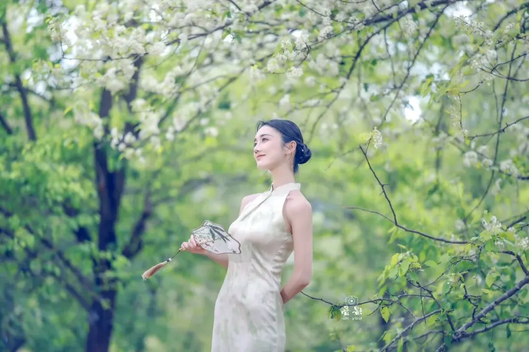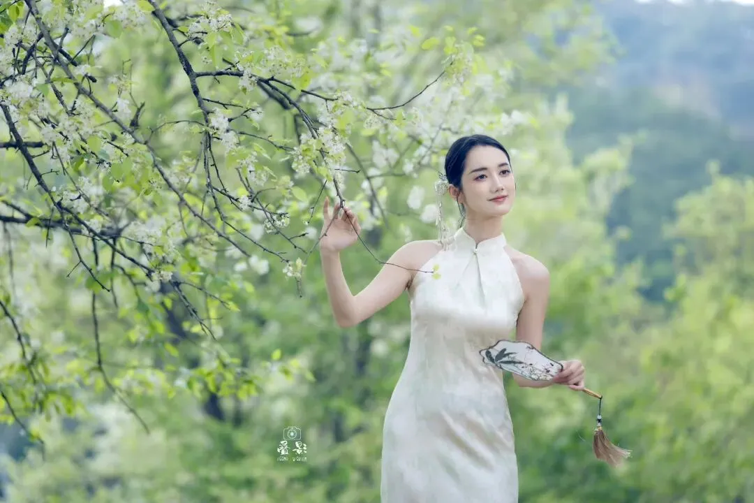 豆梨花身着一袭浅杏色提花旗袍,清冷又温柔。手持兰草团扇,在青秀山的绿意中回眸一笑,这一刻,人景合一,仿佛画中人。
