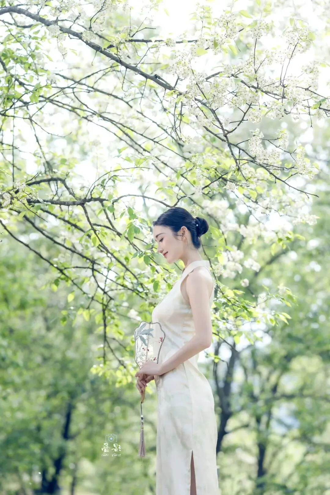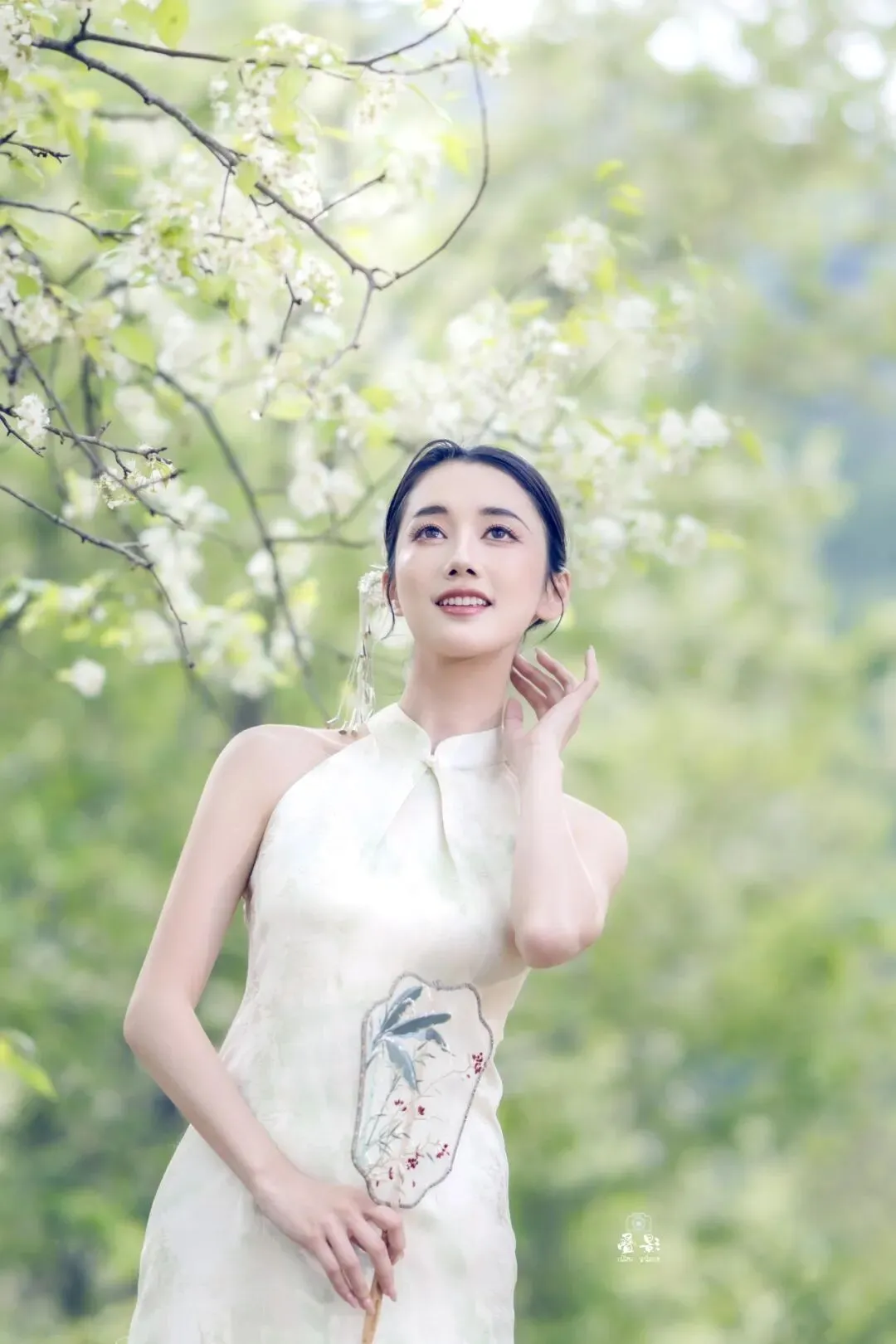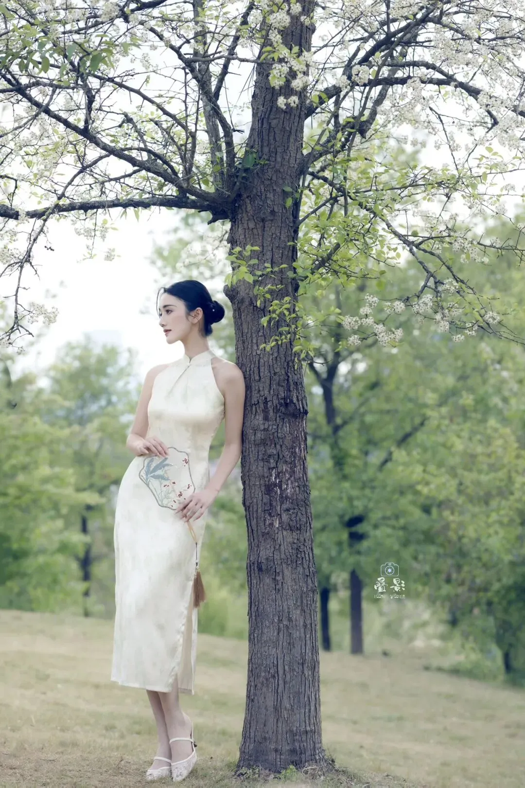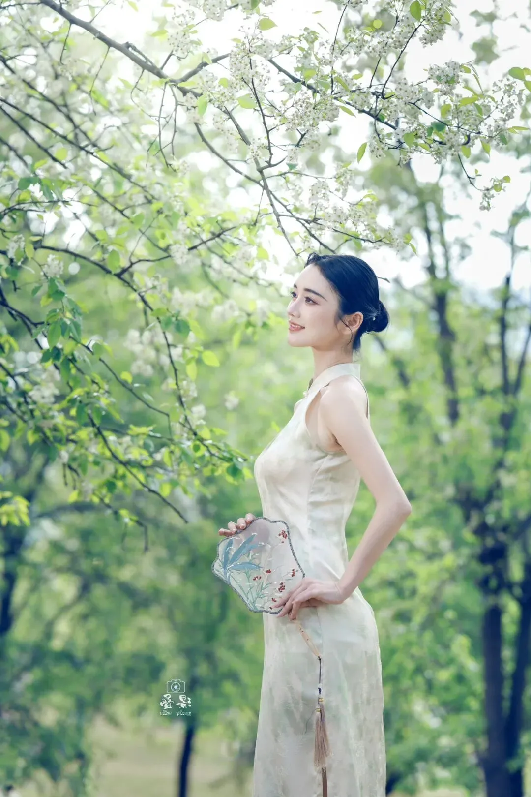 豆梨花身着一袭浅杏色提花旗袍,清冷又温柔。手持兰草团扇,在青秀山的绿意中回眸一笑,这一刻,人景合一,仿佛画中人。