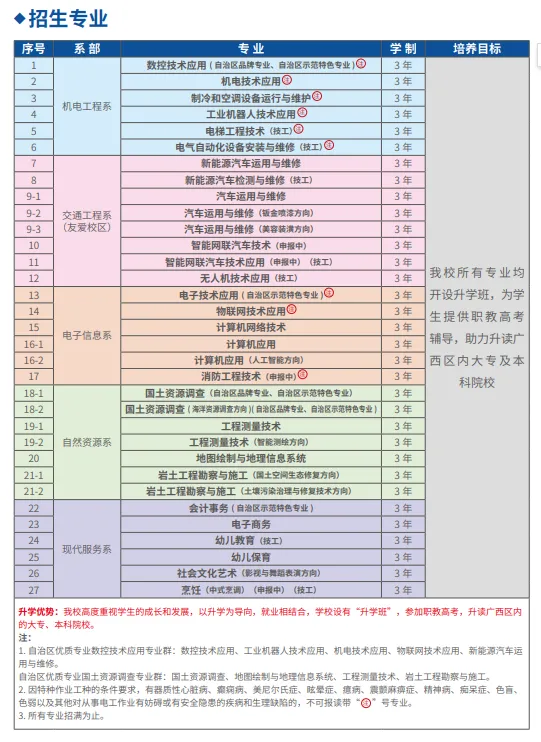 招生条件:招收区内外应、历届初中毕业生或同等学历及以上的学生。 招生办周老师:191 7771 8919 微信同号 升学优势:学校高度重视学生的成长和发展,以升学为导向,就业相结合,学校设有“升学班”,学生参加职教高考,可升读广西区内的大专、本科院校。