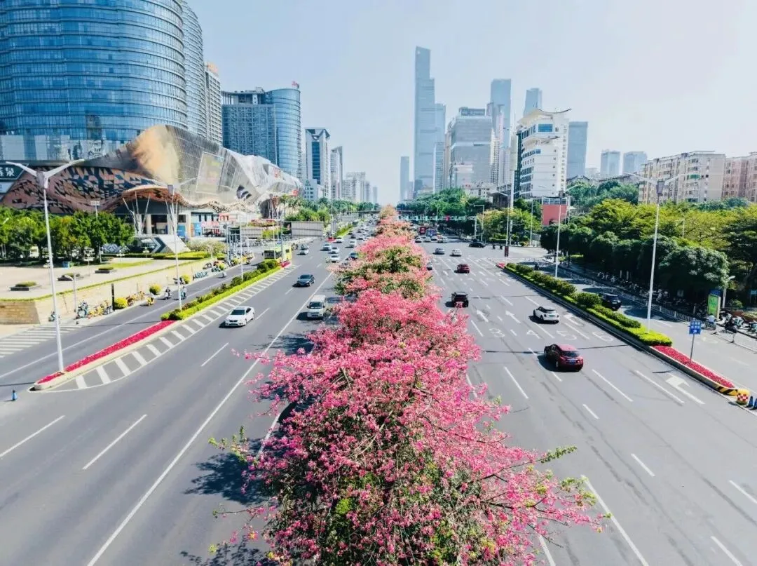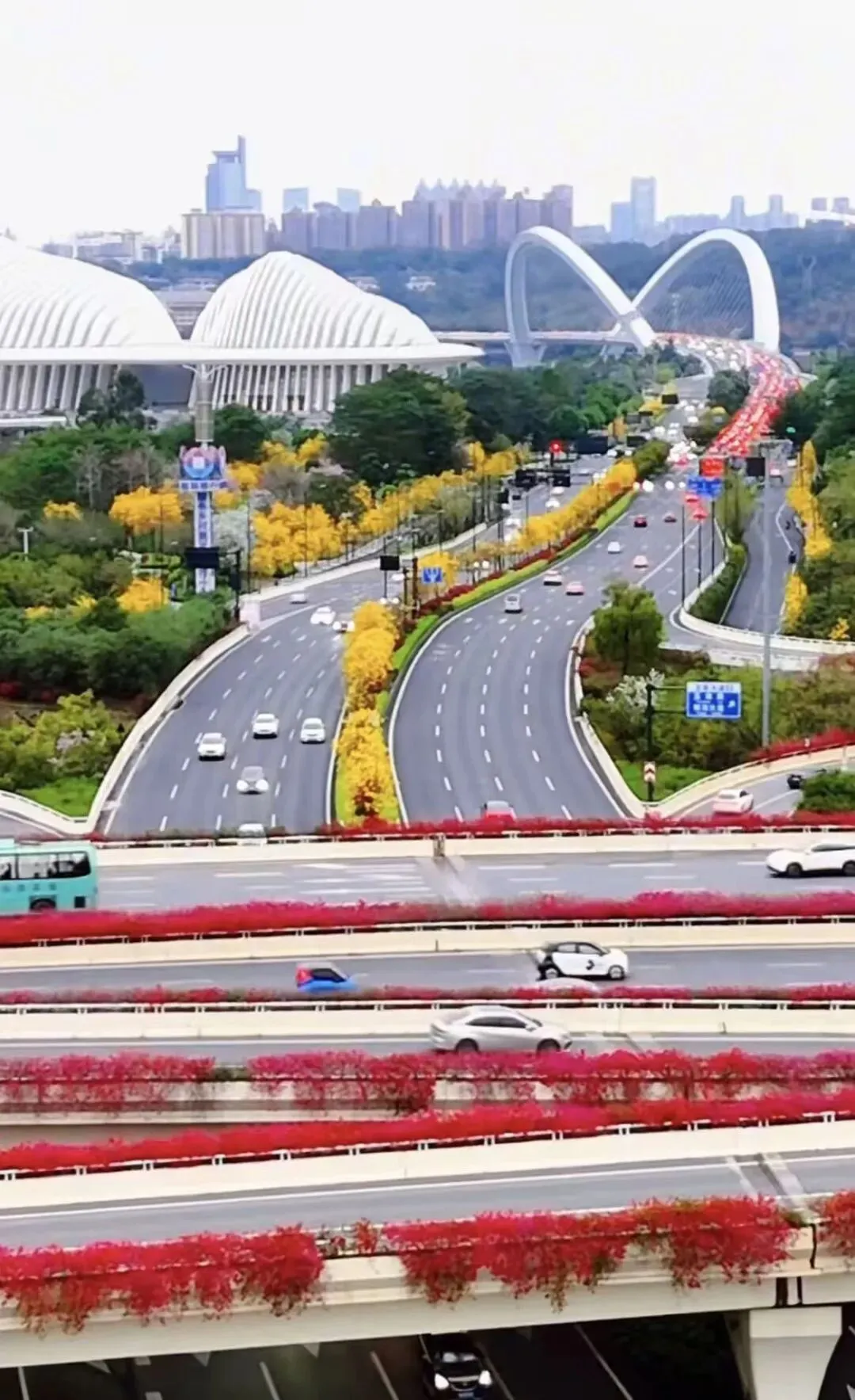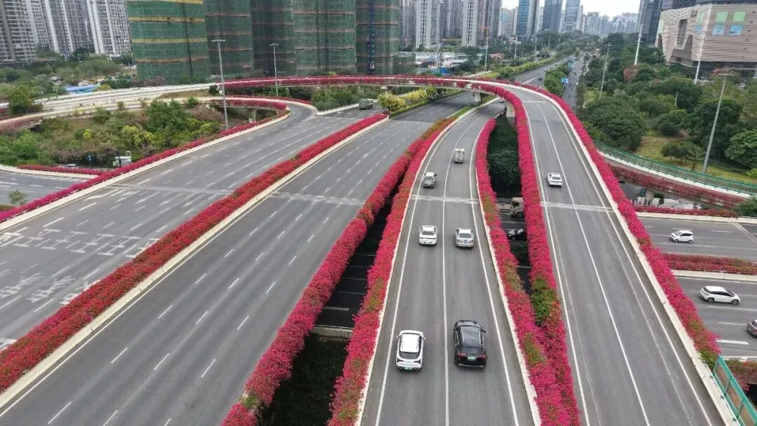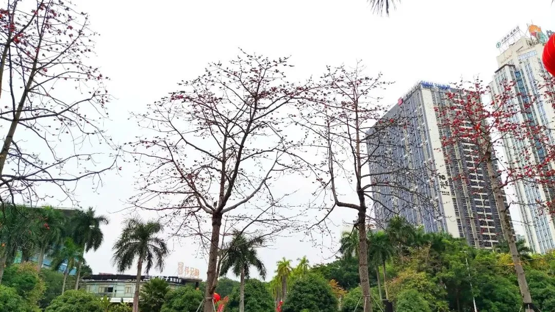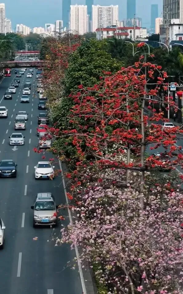 红色:朱槿花,常年会开花。而这个时间段,民族大道的木棉花开了。