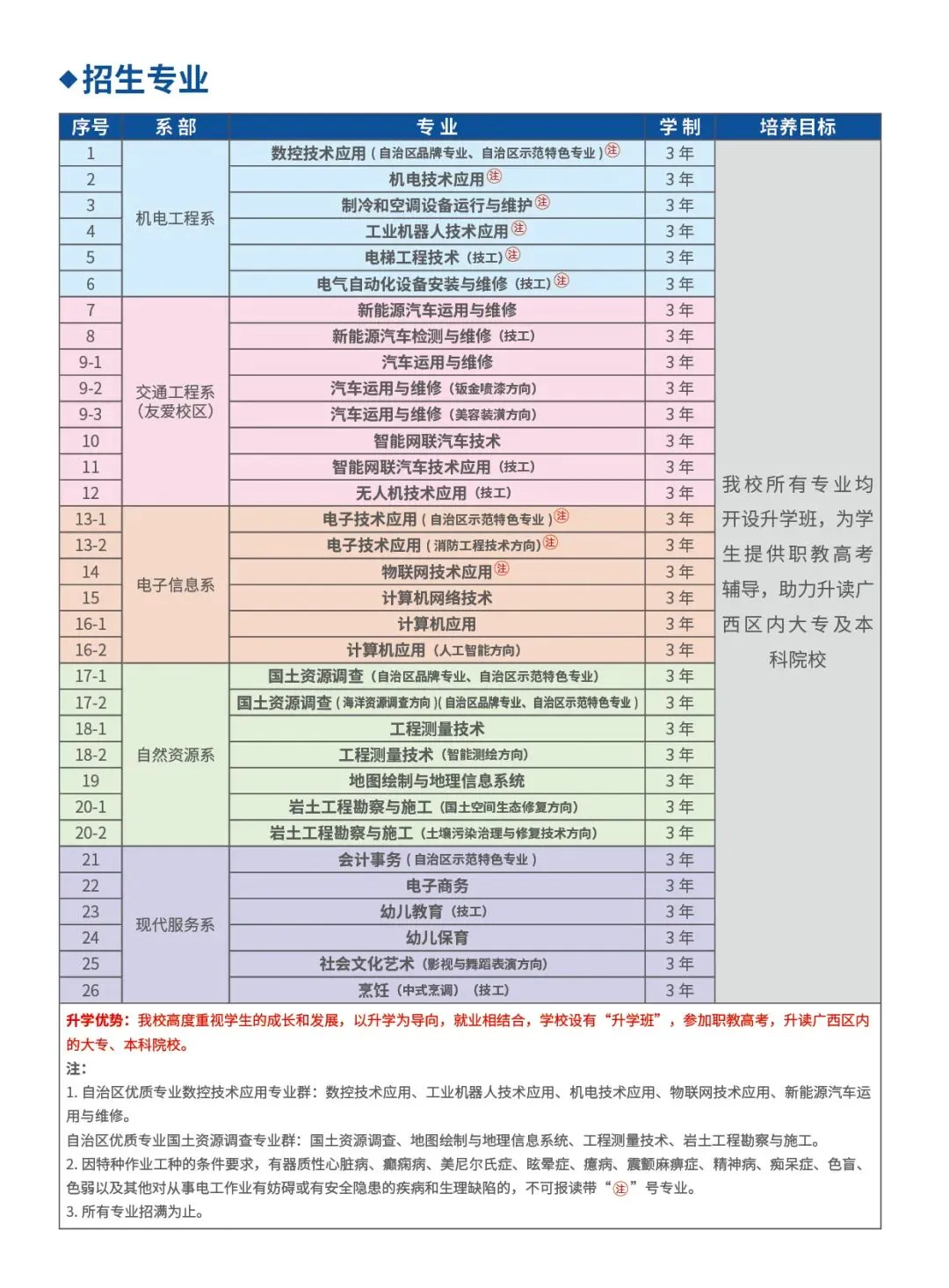 所有专业均可对口升学,与广西多所公办高职院校联合办学,学生可直接报考大专院校,打通「中专→大专→本科」学历提升通道,技能+学历双提升。