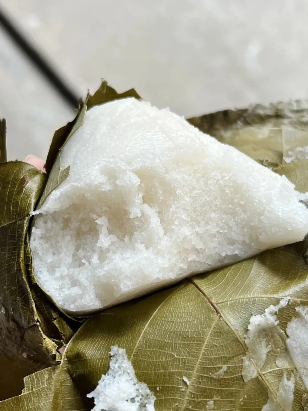 逛集市,偶然看了这个美食。以为是粽子买了几个回来,打开一看原来不是粽子,里面雪白如玉,口感有点像发糕,但是又比发糕更细腻,口感更清新和清甜,带有微微发酵的酸,吃着还可以。它的叶子比较特别,听说这种叶子很少有。问了很多南宁朋友都说不知道这个是什么美食,有认识的朋友吗,它叫什么?