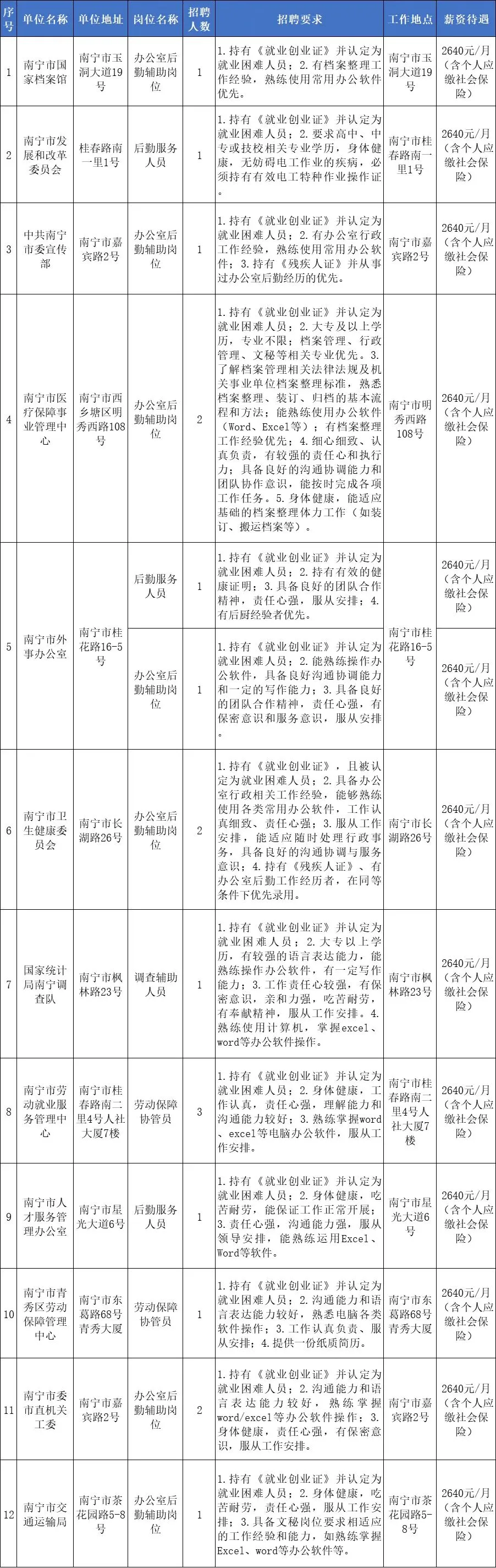 第一步:公开发布招聘岗位信息。人社部门每月向用人单位收集岗位信息并通过南宁市人力资源和社会保障局网站(http://rsj.nanning.gov.cn/)、南宁人社微信公众号等方式向社会公开发布公益性岗位信息及专场招聘会时间;