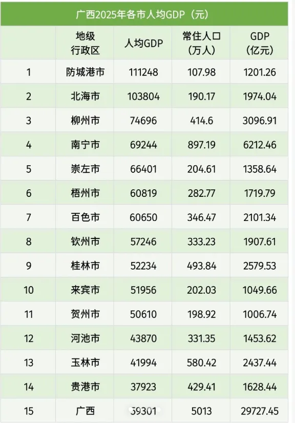 本文数据来源于2025年广西各市人均GDP统计表,具体口径参考官方发布内容。