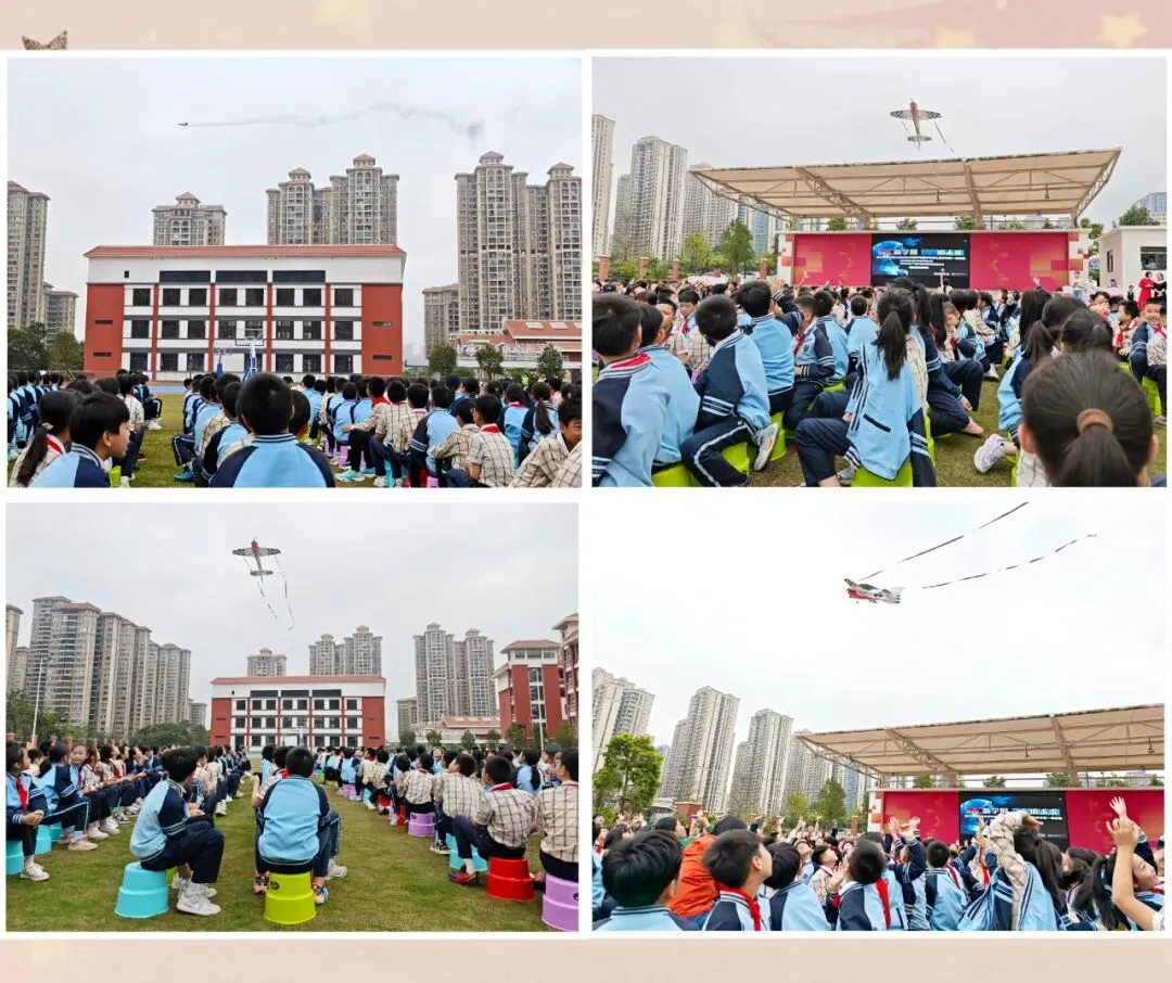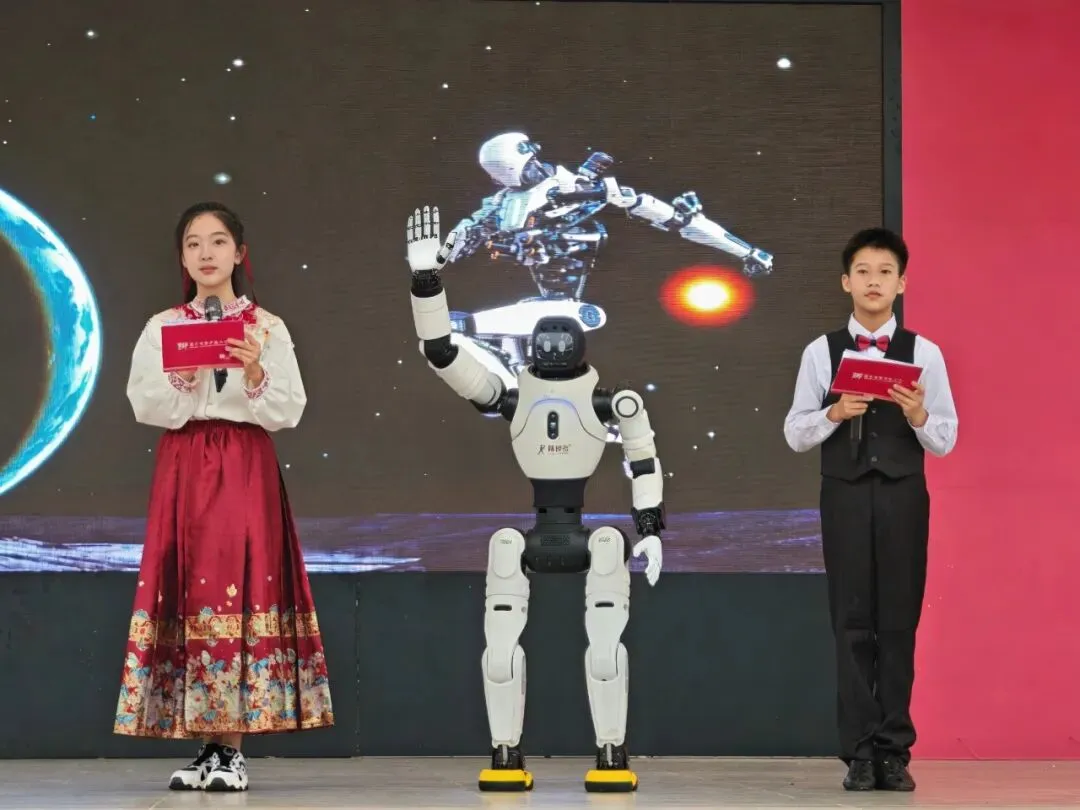 开幕式上,灵犀X2全智能机器人带来舞蹈与太极表演,师生同台人机共舞;航模编队拉烟飞行、空中展示国旗,震撼场面让“科创之星”形象变得具体可感,在孩子们心中种下科创报国的种子。
