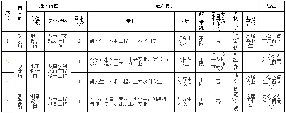 招聘岗位及要求详见《广西珠委南宁勘测设计院有限公司2026年春季公开招聘岗位表》(附件1)。