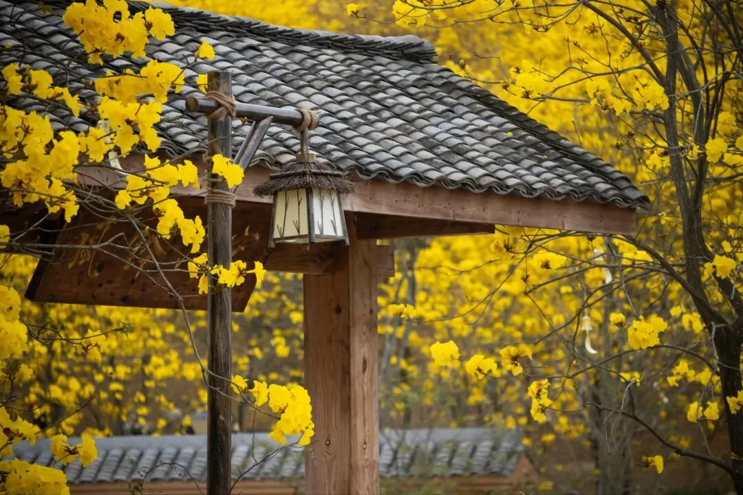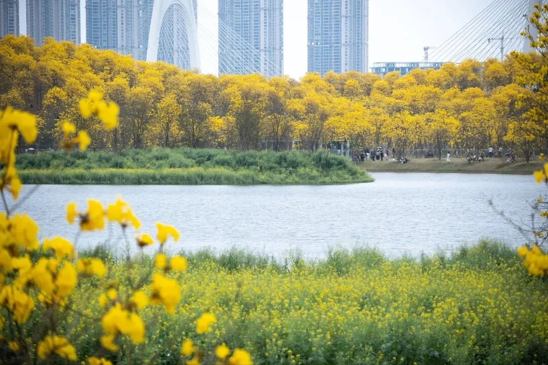 一大片金黄的风铃花开在湖畔边,这景境真美好!