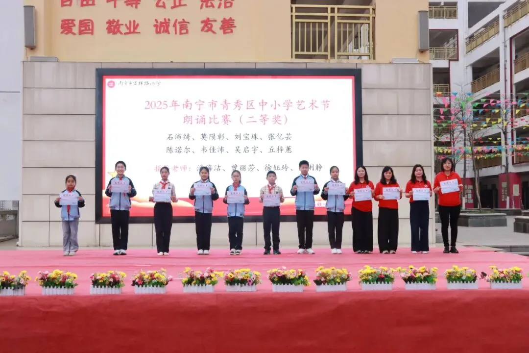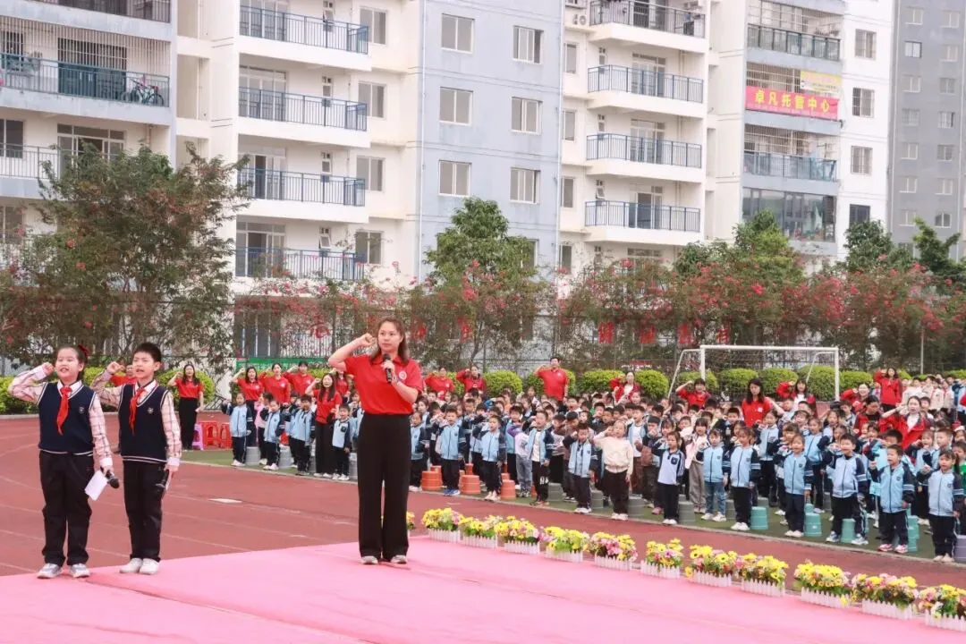 清晨,校级领导与值周行政在校门微笑迎接学子归来,送上新春祝福与返校期许。活动伊始,学生带着对新学期的美好憧憬齐聚操场。伴随着雄壮的国歌与校歌,升国旗、校旗仪式庄严举行,典礼正式拉开帷幕。灵动的开场舞《花开新时代》活力上演,孩子们手持太阳花道具翩翩起舞,传递出生命的美好与追梦的热情。随后,韦校长以“生命的温度与力量”为核心发表寄语,结合雷锋事迹阐释生命的价值;诗朗诵《雷锋叔叔,你在哪里》抒发对雷锋精神的敬仰,学生代表发出学雷锋倡议,现场还为青秀区中小学艺术节朗诵比赛获奖师生颁发荣誉。全体学生在少先队辅导员带领下庄严宣誓,师生齐唱《学习雷锋好榜样》,嘹亮的歌声响彻校园,让雷锋精神与生命教育的种子深深扎根童心。
