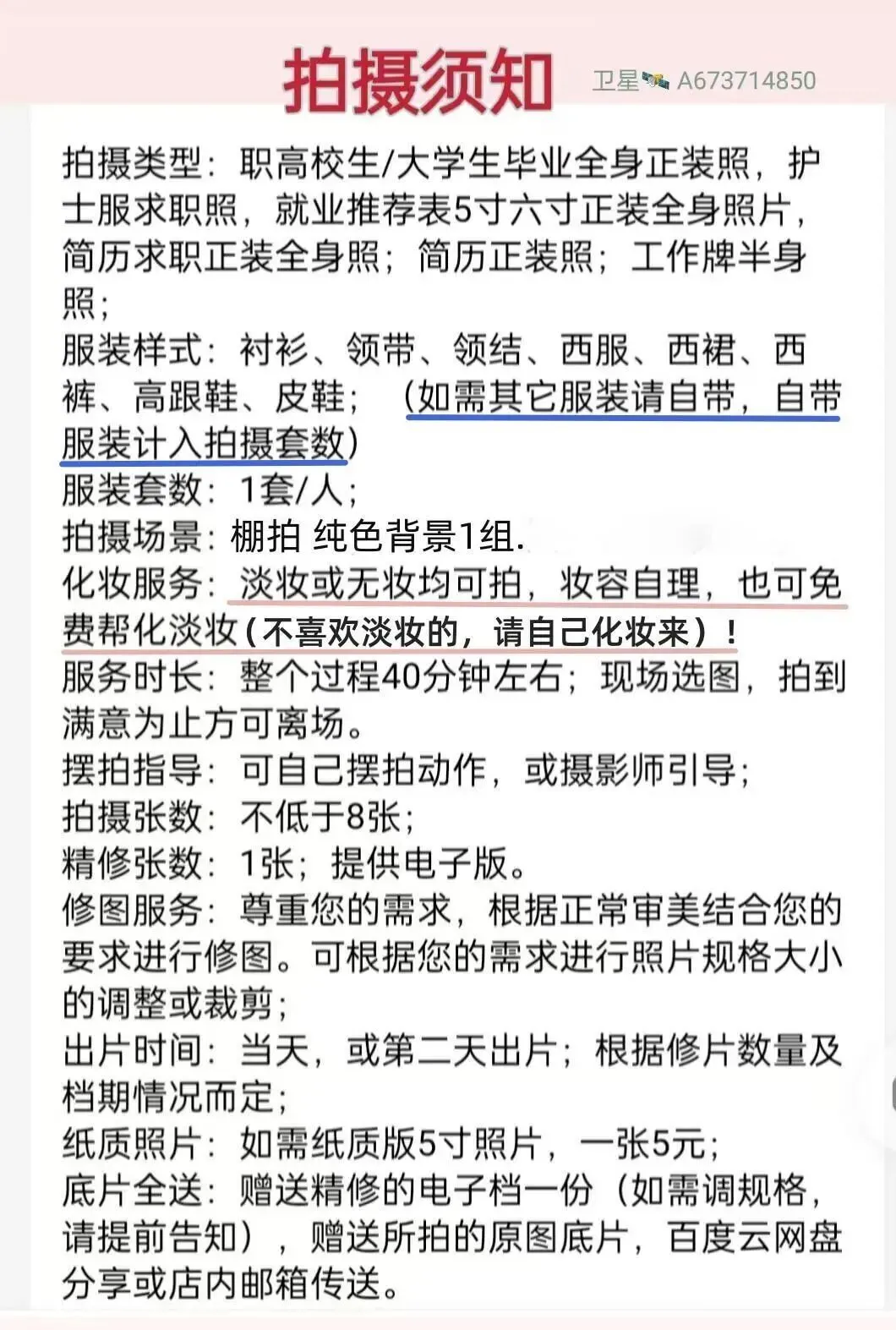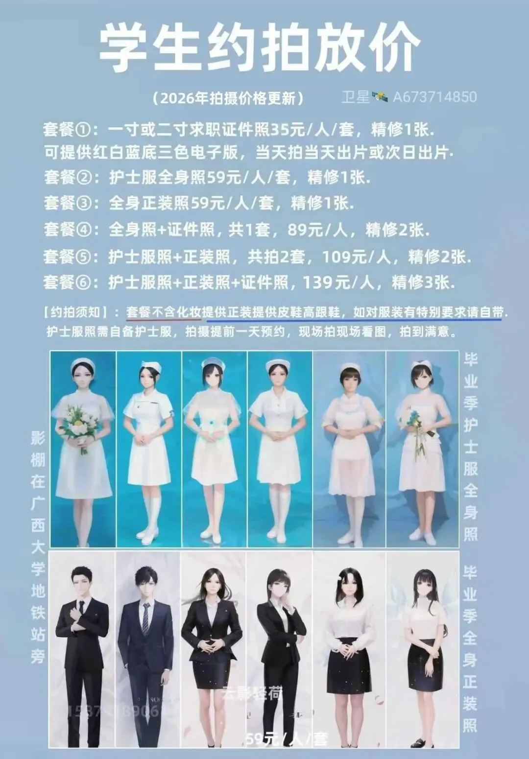 如果你是南宁即将毕业的高校生,如果你正在为拍护士服全身照发愁,大数据让你看到这篇内容,说明你有福不用发愁了,这里推荐一家性价比超赞的摄影工作室。地址就在广西大学地铁站A出口旁边的百汇华庭A座七楼,它就是云影工作室。这家摄影工作室的全身照拍摄价格仅需59元一人,不但提供服装,如果你不会化妆,还免费帮你化个淡妆。拍摄的时候还会教你怎么摆自然的动作站姿哦。并且是拍到你满意为止才让你离场。他们家的具体拍摄套餐信息都写在图片里了,需要拍摄的同学们可以看一下哦。拍就业推荐表的全身照需要注意一点,不要浓妆,适当化些淡妆拍照即可,男生尽量不要留胡子,女生能不贴假睫毛就尽量不要贴。照片不要选搞怪表情,拍照时尽量穿着得体,看起来爽朗阳光或者保持平时自然的面貌即可。求职简历照,白大褂医护证件照,护士服简历照,各种证件照,正装照,全身照,医生医师毕业证照,护士服照,空乘照,幼师全身照,就业推荐表简历照;(护士服建议自己自备,如果没有,也可以穿影棚里的,影棚有备用服装)赶紧约上同学一起去拍吧。不到百元就能搞定,在南宁来说,性价比真的很不错!📍 门店地址:南宁市西乡塘 区明秀西 路 118号百汇华庭A座七楼云影工作室(就在广西大学地铁站A出口左前方五十米处,电梯入口在依心宠物医院楼后面)