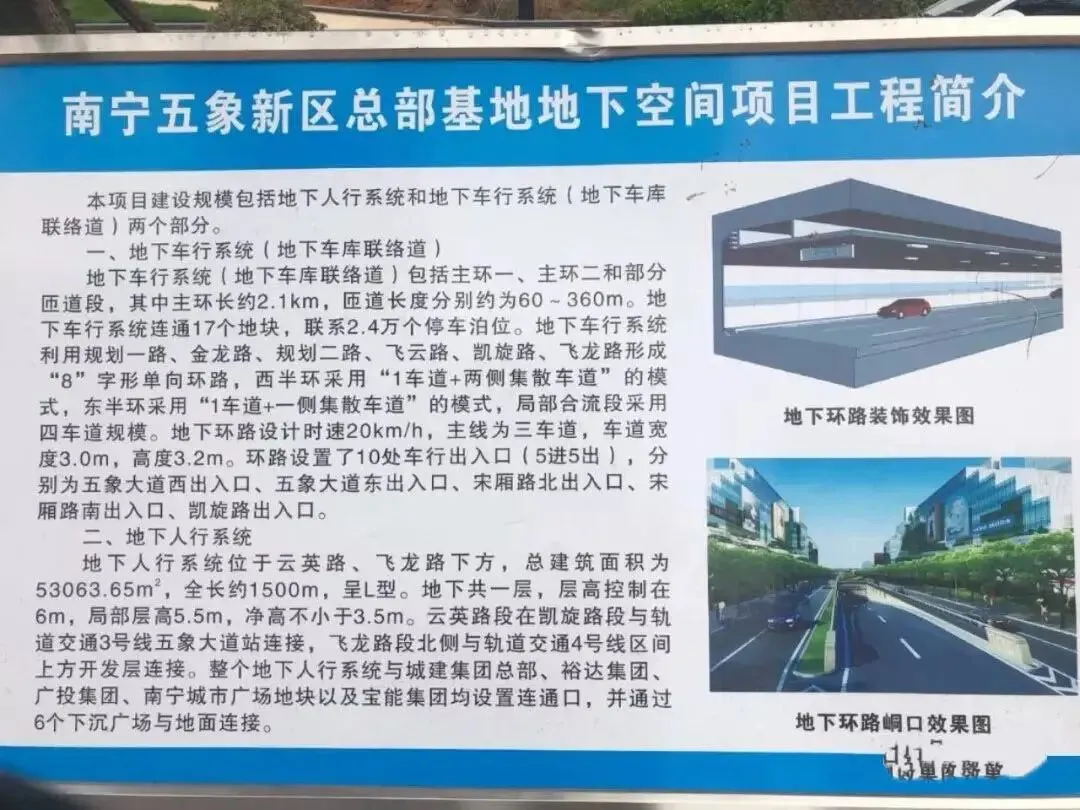 该项目是广西首个大型地下空间综合开发项目,位于五象新区总部基地金融街核心区域,2018年11月30日竣工,总长度约6.2公里,面对高密度区域交通拥堵、空间不足等共性难题,以“纵向空间复合利用”为核心,通过系统化地下设计,构建了高效联通、人车分流的立体网络。项目主要建设内容为两部分: