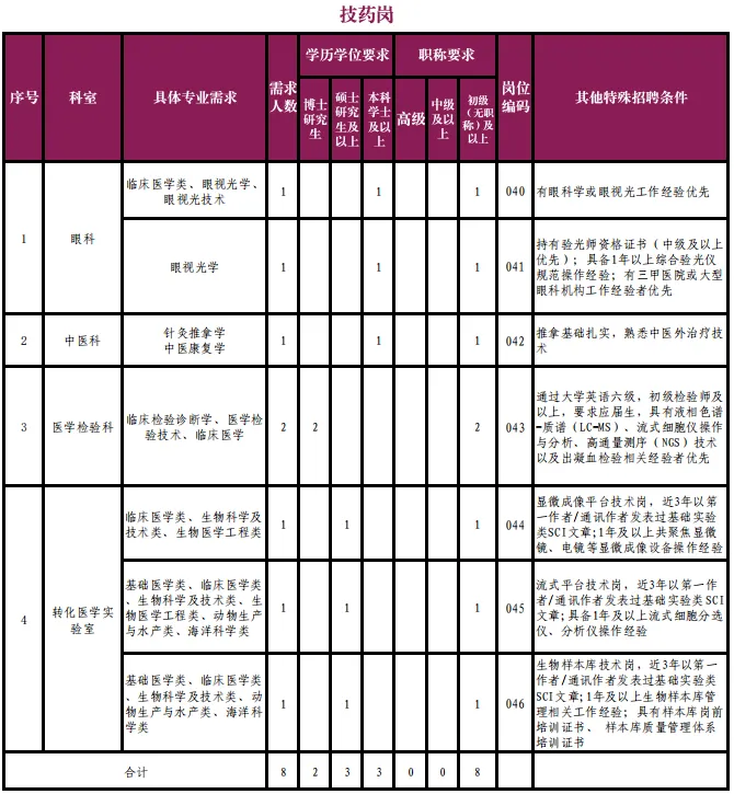 3.如岗位无特殊说明,技药岗应聘人员须通过大学英语四级考试,医教研岗应聘人员原则上须通过大学英语六级考试(高级职称可适当放宽)。GRE、GMAT考试成绩优秀者优先,国(境)外留学人员须提供相当水平外语成绩证明。