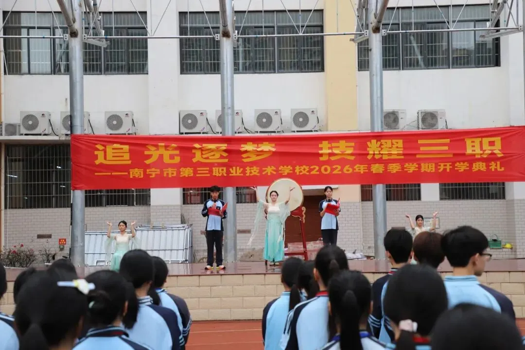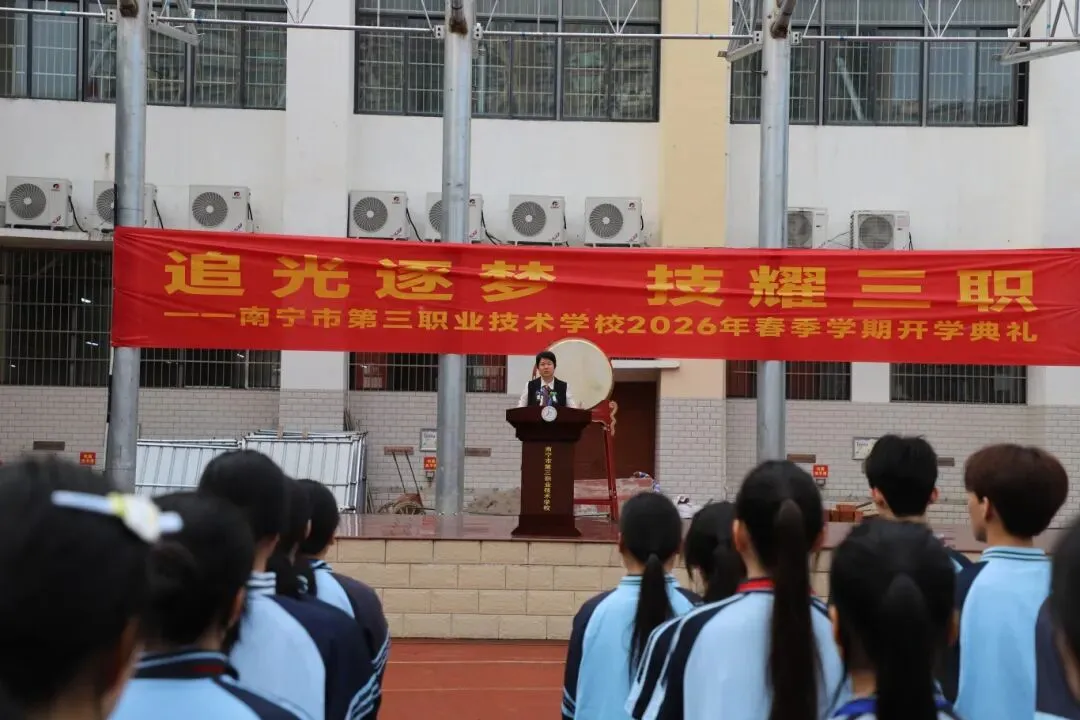 3月2日,南宁市第三职业技术学校分别在望州校区和东盟校区隆重举行了2026年春季学期开学典礼。全校师生员工以饱满的精神面貌,共同迎接新学期的到来。学校党委书记黄玲芝、校长陆锡都分别出席望州校区、东盟校区典礼并致辞。