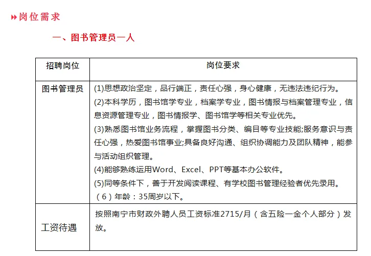 招聘程序应聘人员投递个人电子简历(简历和证书合成一份PDF格式,不超过5M)至nnszxbzp2022@163.com,邮件主题格式和简历名称为“编外岗位(图书管理员)+姓名”例如:图书管理员+张三”或“毕业学校+科目+姓名+意向校区”例如:XX师范大学+数学+李四”。