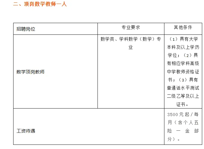 小学数学教师1名任职要求大专及以上学历,具有相应的教师资格证、普通话等级证,年龄40周岁以下,有教学经验者优先考虑。