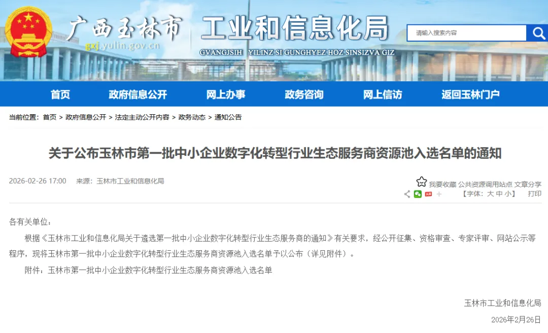 春潮启序,捷报频传!近日,经玉林市工业和信息化局公开征集、资格审查、专家评审及公示等多轮严格遴选,南宁国电电力科技有限责任公司凭借扎实的技术实力、丰富的服务经验及完善的服务体系,成功入选玉林市第一批中小企业数字化转型行业生态服务商资源池名单,这份荣誉既是政府部门对公司数字化服务能力的高度认可,更是对我们深耕数字化领域、赋能中小企业发展初心的有力肯定!