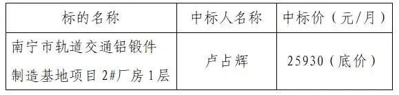 >南宁市轨道交通铝锻件制造基地项目2#厂房1层招租中标结果公示
