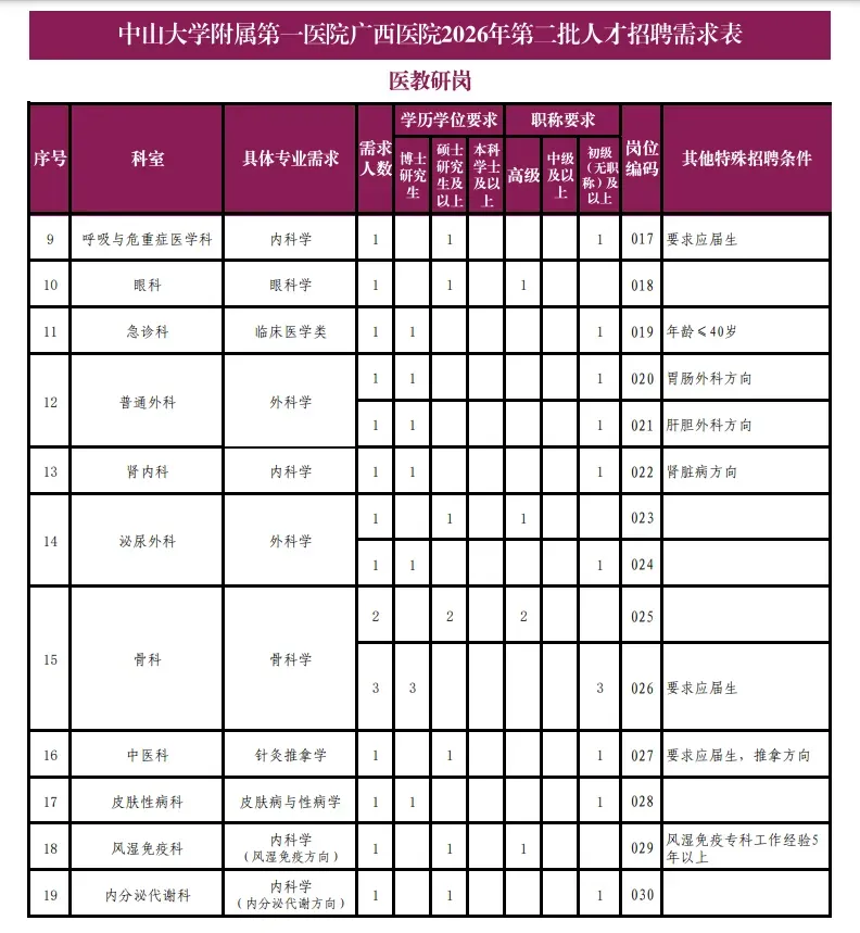 附件:中山大学附属第一医院广西医院2026年第二批人才招聘需求表.pdf
