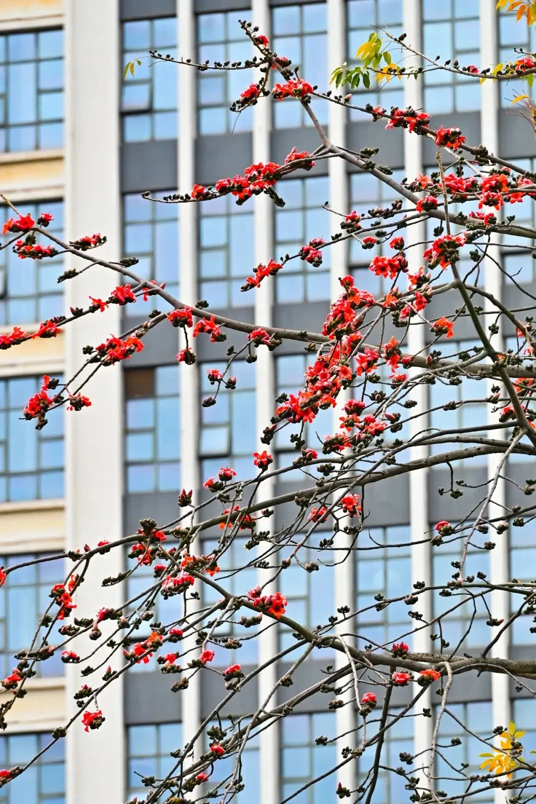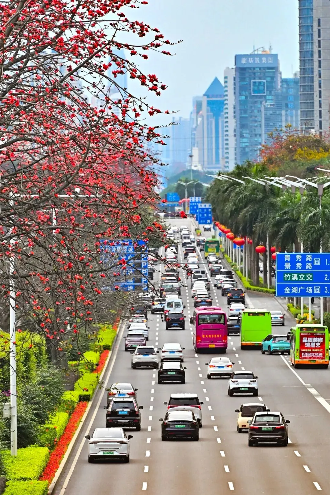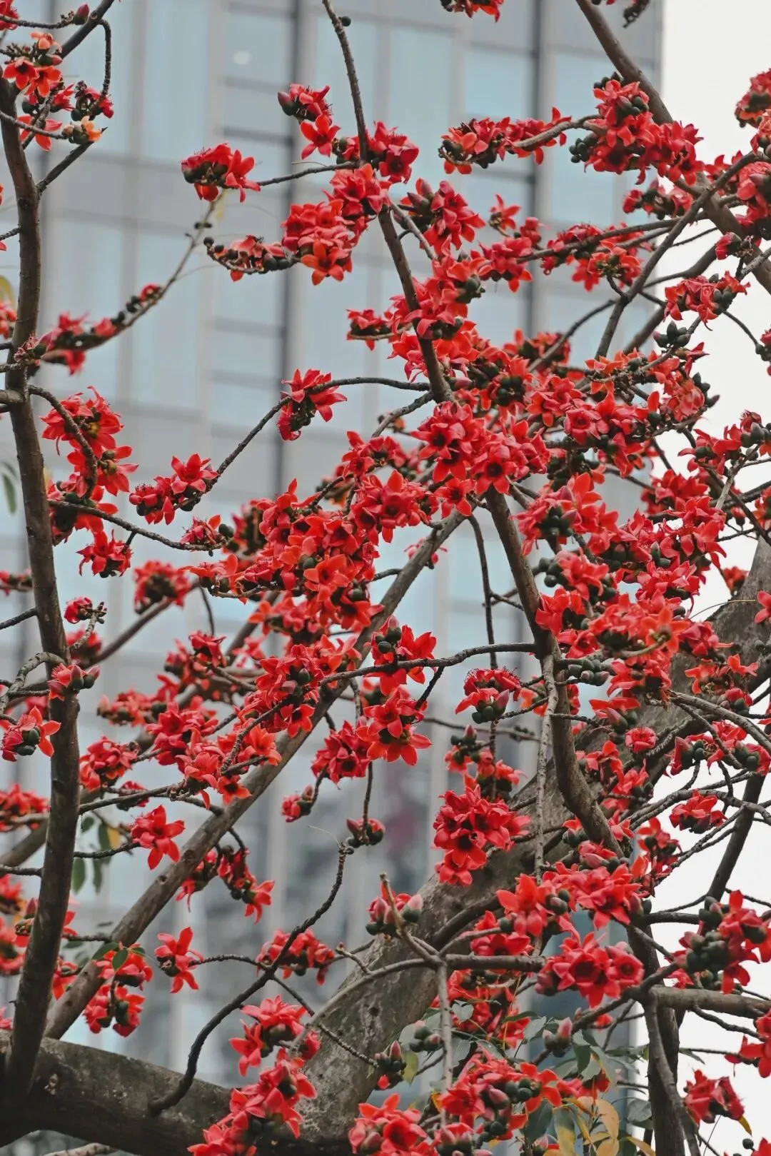 一朵朵,一串串,红得耀眼,红得纯粹,宛如无数精巧的“小灯笼”,高悬于枝桠之间,为这座绿意盎然的南国都市披上了一层绚烂的霞帔。