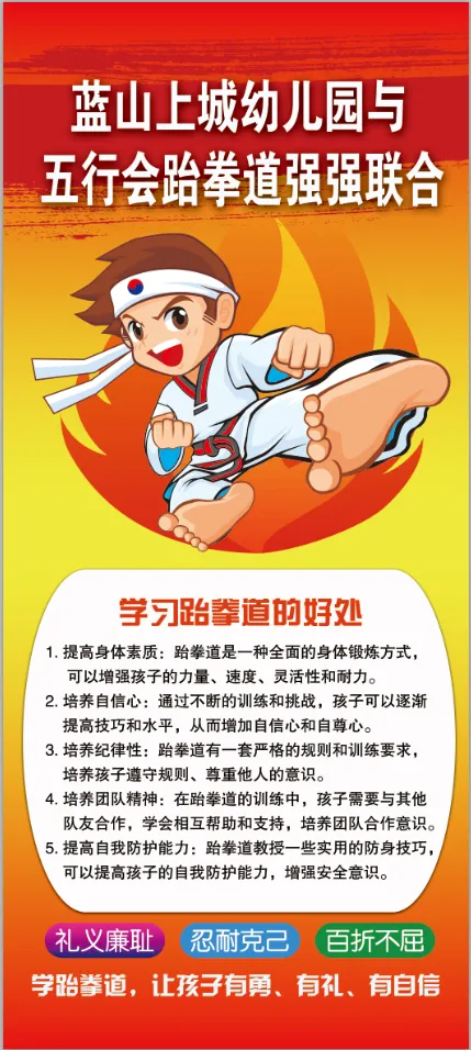 跆拳道是一种实用的防身术,也是一种减压健康运动,锻炼孩子身体,让孩子有一个健康体魄的同时,也懂得遇到危险如何保护自己。各种腿法,手臂的上格、下截、拉伸等动作,可使肌肉力量得到增强。培养全身心协调配合,提高身体灵敏度、力量和速度。可以给大脑许多良好的刺激,非常有利于发展幼儿的空间转换、形体感知,提高形象思维和创造力。锻炼幼儿的意志,培养勇敢精神,学会对人、事、物的正确态度。