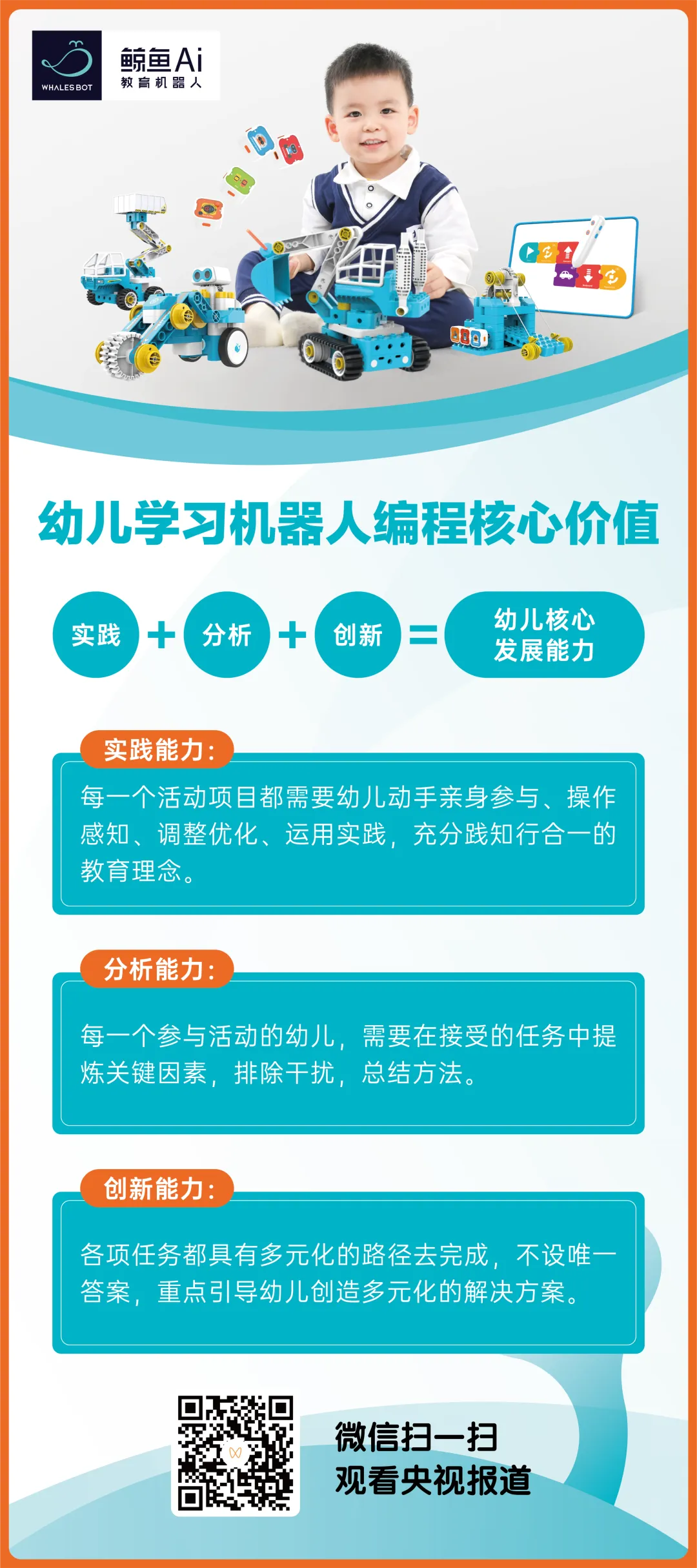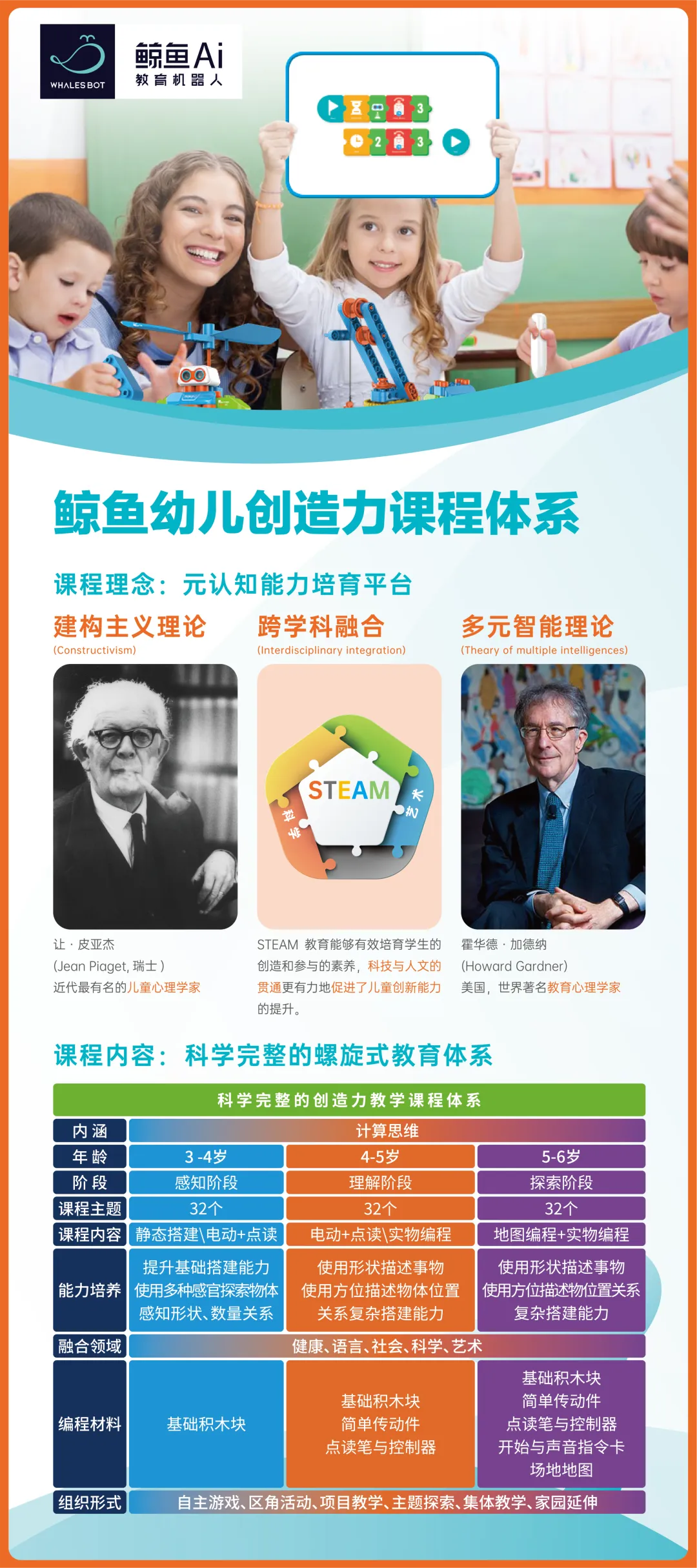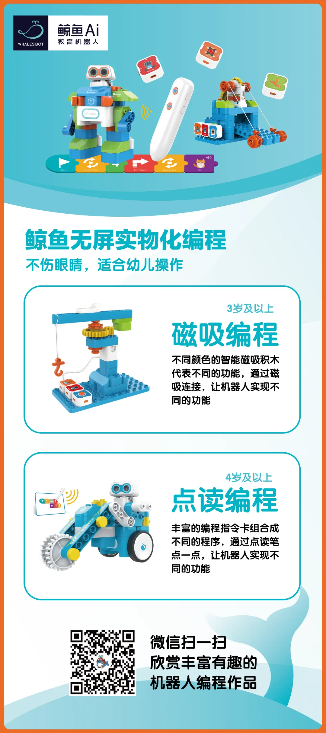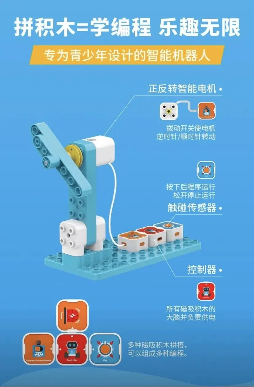 1、采用全球销量第一的教育机器人——鲸鱼机器人编程,编程方式丰富,课程体系完善,小年龄学磁吸编程,大年龄学点读编程,小、中、大、学前,都能学,难度逐步提升。