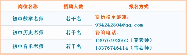 要求本科及以上学历,具有相关学历毕业证、学位证、教师资格证、普通话等级证书,有初中教学经验者优先。