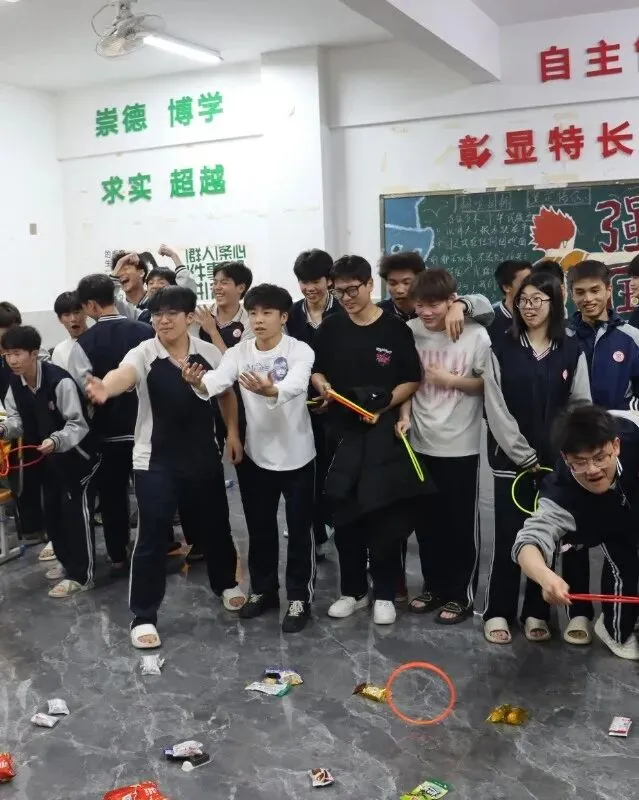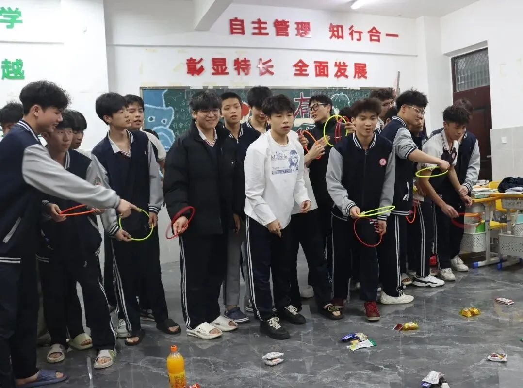 高69(乙)班,教室里一片欢声笑语。这里正在举行“师生同乐闹元宵”的主题班会。热情的同学们和平日里严肃的科任老师一起参加游戏;师生之间的距离在游戏中被瞬间拉近。在这个特别的夜晚,感恩成为主旋律。在高70班,学生们玩起了抛圈子套奖品的游戏,热闹非凡。