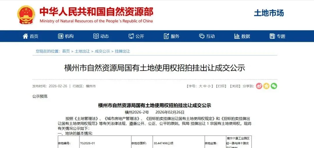 2月26日,广西壮族自治区南宁市横州市成交1宗工业用地,该地块由南宁太阳纸业有限公司斩获,成交价8130万元,成交楼面价297元/㎡