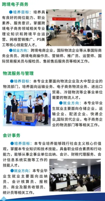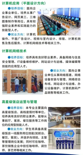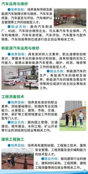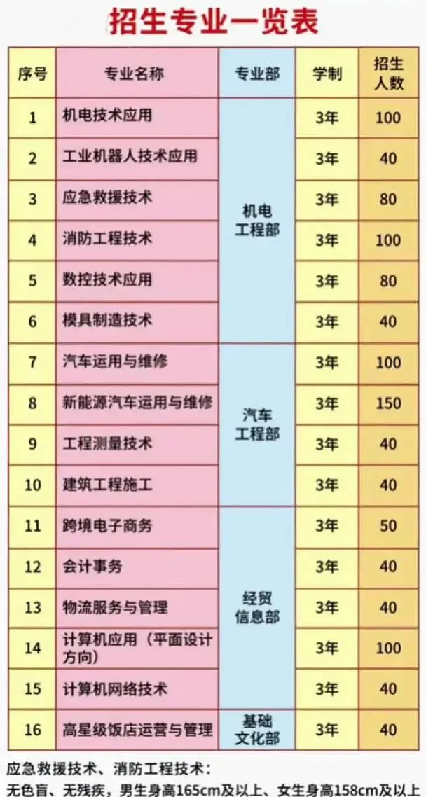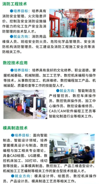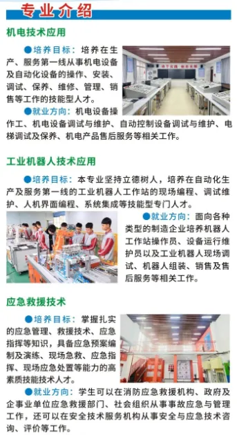学校开设机电技术应用、工业机器人技术应用、应急救援技术、消防工程技术、数控技术应用、模具制造技术、汽车运用与维修、新能源汽车运用与维修、工程测量技术、建筑工程施工、跨境电子商务、会计事务、物流服务与管理、计算机应用(平面设计方向)、计算机网络技术、高星级饭店运营与管理等16个专业,覆盖资源环境与安全、土木建筑、装备制造、电子与信息、财经商贸、旅游及交通运输七大领域。