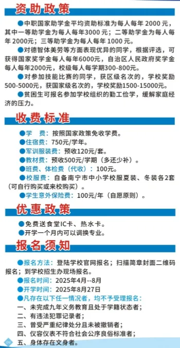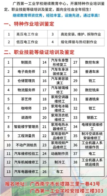 广西第一工业学校报读分数要求:中考出成绩前不看分数,中考出成绩后从高到低录取,择优录取,录满截止,故每年的分数要求不一样,所以家长要提前给孩子预定名额。