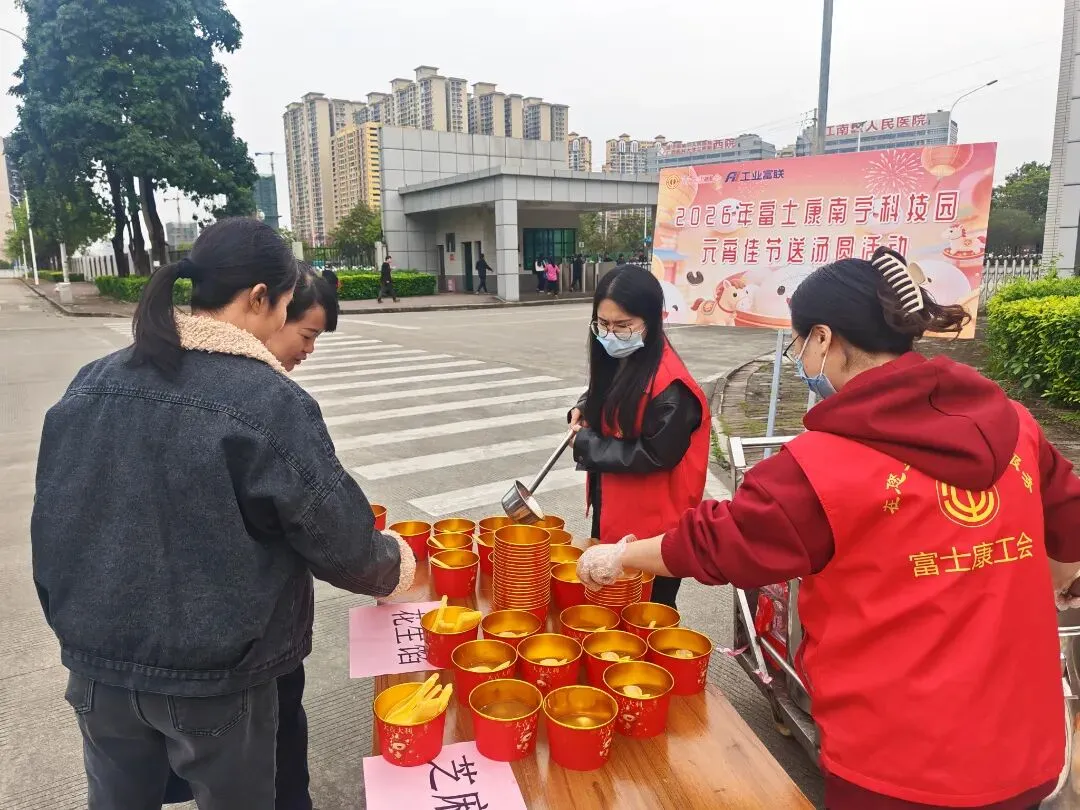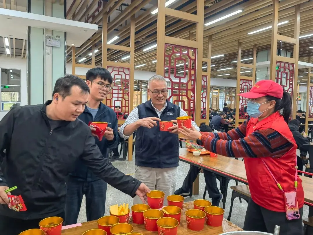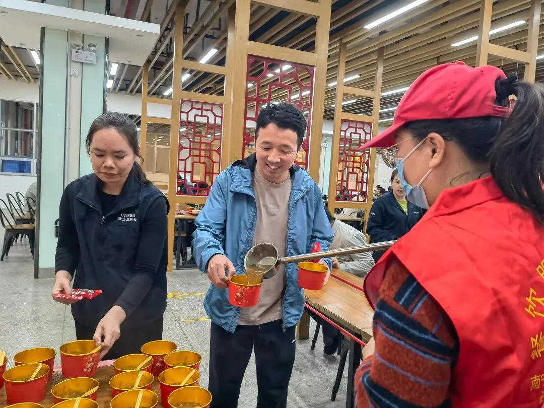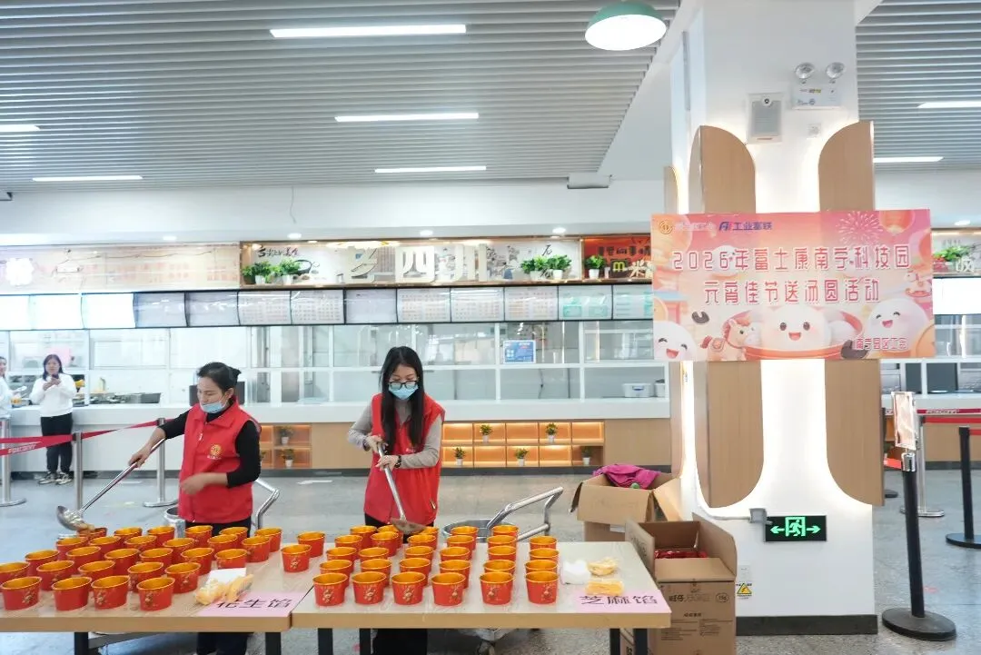 此次活动在沙井园区B26餐厅、B21餐厅、南门及富宁厂区6楼同步开展。考虑到员工工作与就餐时间不同,园区工会安排了中午、晚上两场派送,累计送出汤圆2100余碗,确保不同岗位、不同时段的员工都能收到这份节日心意 。