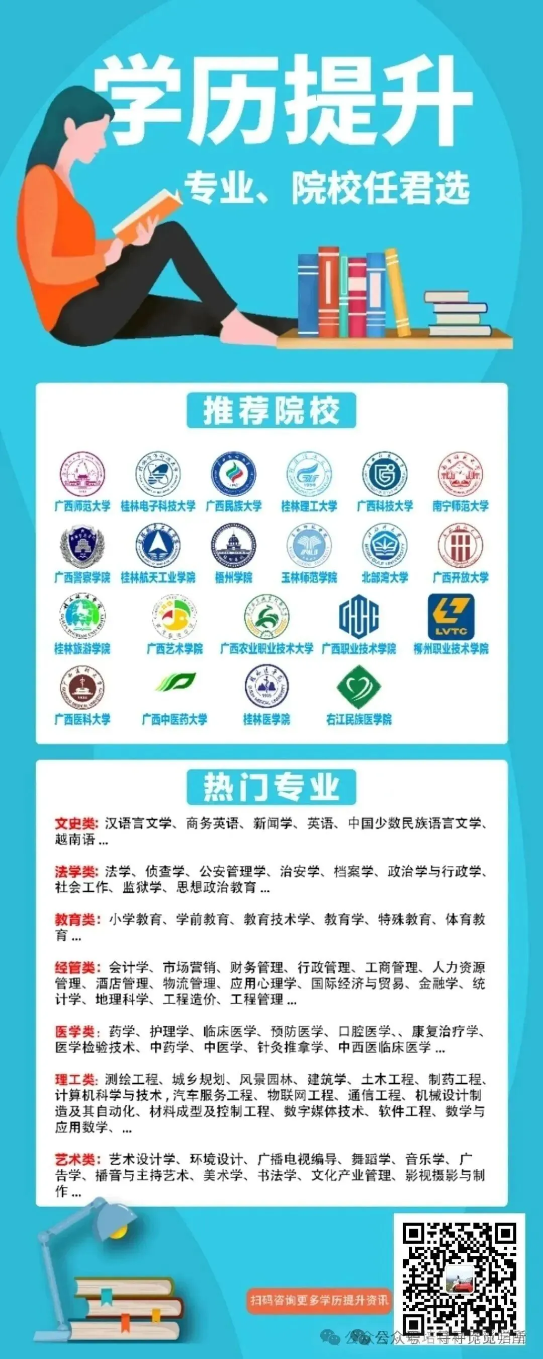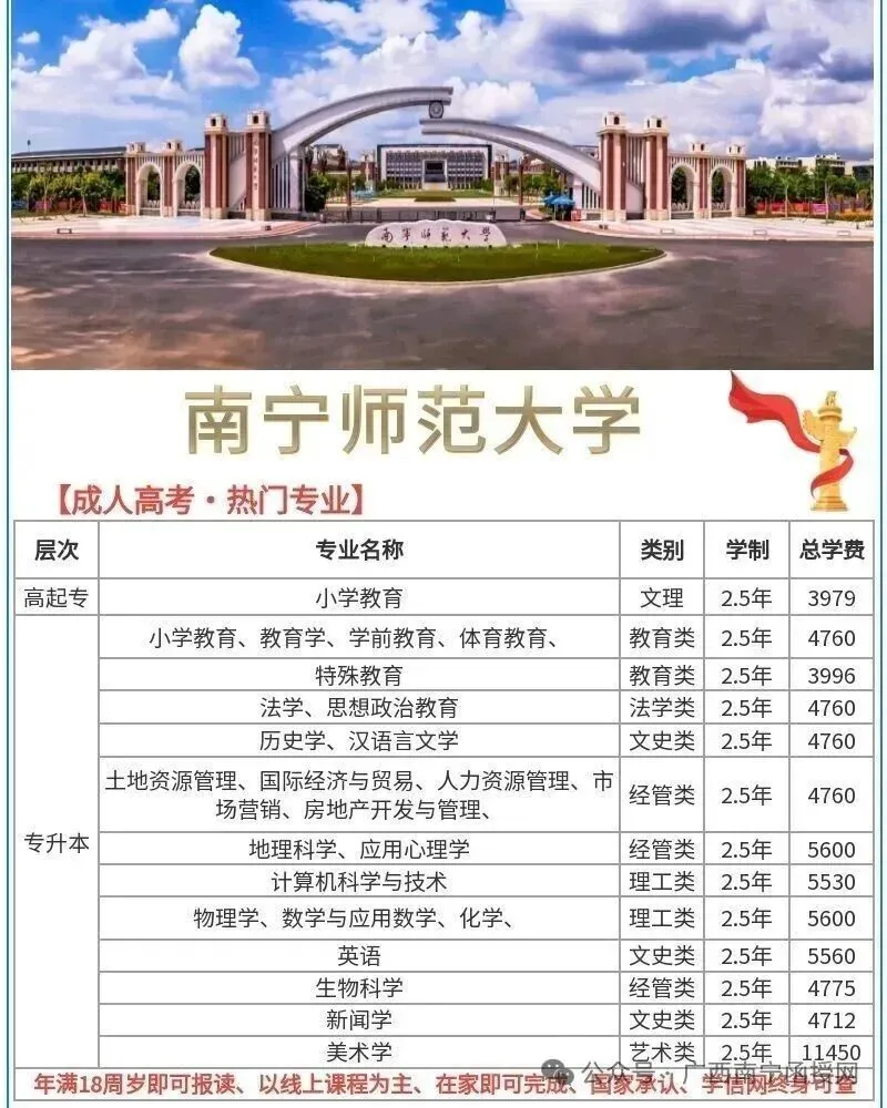 - 报名考试费:广西统一约100 元 / 科(高起专 3 科约 300 元,专升本 3 科约 300 元),由考试院收取