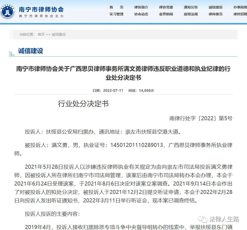 投诉人:扶绥县公安局扫黑办,通讯地址:崇左市扶绥县空港大道。被投诉人:满文勇,男,执业证号:14501201110289013,广西思贝律师事务所执业律师。2021年5月28日投诉人以涉嫌违反律师执业有关规定为由向崇左市司法局投诉满文勇律师,因被投诉人所在律所归南宁市司法局管理,该案后由南宁市司法局转办本会办理,本会于2021年6月24日受理该案,于2021年8月6日决定对该案立案调查。2021年9月14日本会作出了对被投诉人的拟处分决定,被投诉人于2021年12月2日提交听证申请,本会于2022年2月28日向投诉人发出听证通知书,2022年3月11日举行听证会,现本案已调查终结。2019年4月,投诉人接收扫黑除恶专项斗争中央督导组转办的线索中,举报扶绥县东门镇葛村的黄叶初涉嫌故意伤害、寻衅滋事等违法犯罪问题,同年6月份投诉人已组织警力对举报问题进行核查并反馈举报人办结完毕,2019年6月3日因黄叶初涉嫌故意伤害罪被扶绥县公安局执行逮捕,2019年6月4日因病被取保候审。2021年4月29日,黄叶初到扶绥县公安局东门派出所提供其涉及案件的证人林国东等证言材料复印件,称其看了举报人、证人提供给公安机关的证言、举报内容不属实,其本人没有犯罪行为,要求再次调查处理。投诉人单位民警对黄叶初持有证人材料复印件的来源进行询问,黄叶初称其所持材料均由他的辩护律师满文勇(南宁市执业律师)提供。满文勇律师擅自将其代理案件的证人材料向案件嫌疑人披露或者提供,引发犯罪嫌疑人和证人、举报人之间的矛盾,造成极大的安全隐患,违反了律师执业相关规定。2.经查,黄叶初所获取的相关案卷材料确系黄叶初本人在被投诉人代理该案期间从被代理人处所获取。被投诉人申辩其行为并未违反律师执业相关禁止性规定,根据《刑事诉讼法》第三十七条、《律师办理刑事案件规范》第二十五及二十六条等规定,辩护律师自案件移送审起诉之日起,可以向犯罪嫌疑人、被告人核实有关证据,但向犯罪嫌疑人、被告人核实有关证据并不说明辩护律师可以向犯罪嫌疑人、被告人提供案件材料证据,该行为违反了律师执业禁止性规定。被投诉人的上述行为已经违反了《律师协会会员违规行为处分规则(试行)》第十五、十八、四十一条的相关规定:决定给予被投诉人满文勇训诫的行业处分。被处分的会员如不服本决定,可在接到本决定书之次日起十五个工作日内以书面形式向广西壮族自治区律师协会申请复查,并提交书面一式两份复查申请书。《律师协会会员违规行为处分规则(试行)》
