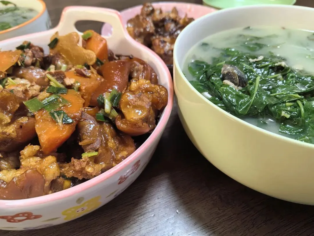 黎大厨亲自掌勺,做了红烧猪蹄和枸杞叶汤。