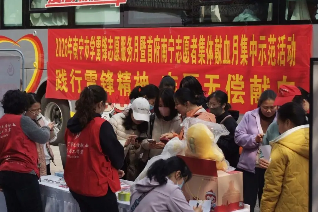 在第63个“3・5”学雷锋纪念日来临之际,3月4日下午,由共青团南宁市委联合市委社会工作部、市民政局、市卫健委主办的2026年南宁市学雷锋志愿服务月暨首府南宁志愿者集体献血月集中示范活动,在江南区百益上河城暖心启幕。市志愿服务工作协调机制43家成员单位代表、社区群众、青年志愿者等近500名各界代表齐聚现场,以志愿行动传承雷锋精神,为共同奋进“十五五”凝聚青春力量。