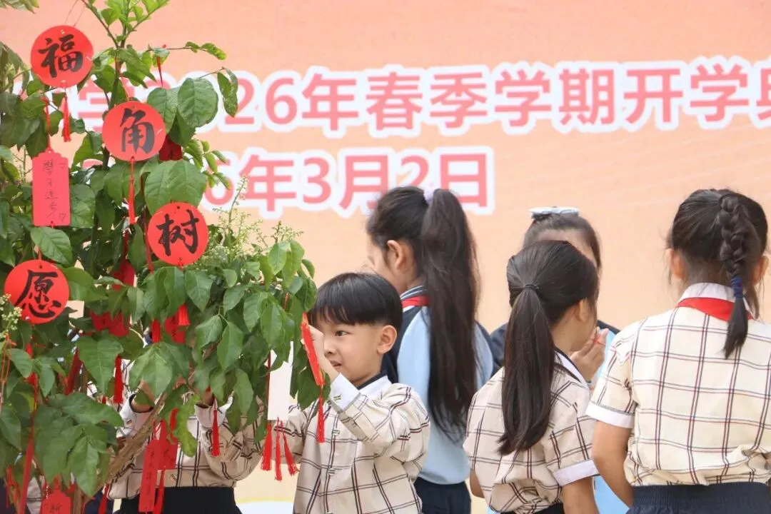 典礼最后举行了温馨的“幸福皂角心愿树”寄托心愿活动。在莫施媛老师的组织下,各班代表将写满美好愿望的心愿卡挂在心愿树上。一张张心愿卡承载着孩子们对新学期的期待与祝福,也象征着皂角小学这个大家庭的温暖与团结。