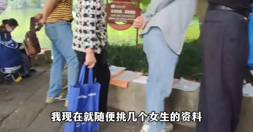 我看到有不少人的手上或者地上都摆满了各种的相亲资料。这个场面说真的,如果不说这个是相亲角,还以为这里是卖菜的,还真是有几分相似。那些相亲资料就是明码标价,供别人去选择、去看,看上就跟他进一步交流。