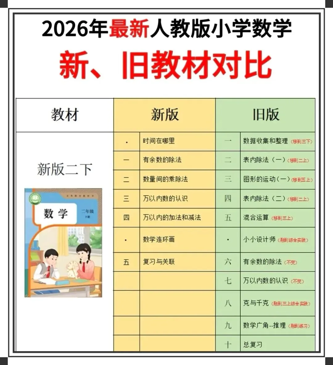 我梳理了近段时间的教学观察和教材对比,新版二下数学有这几个核心变化: