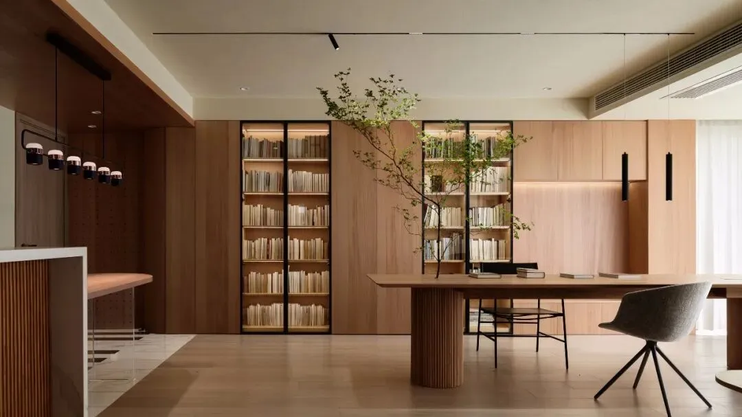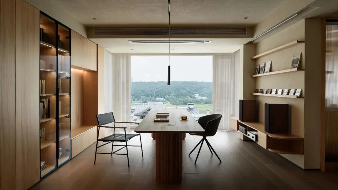 没有沙发,没有茶几,更没有电视,一张大长桌便是整个客厅的全部,同时搭配落地书柜。