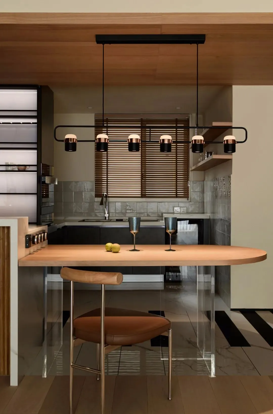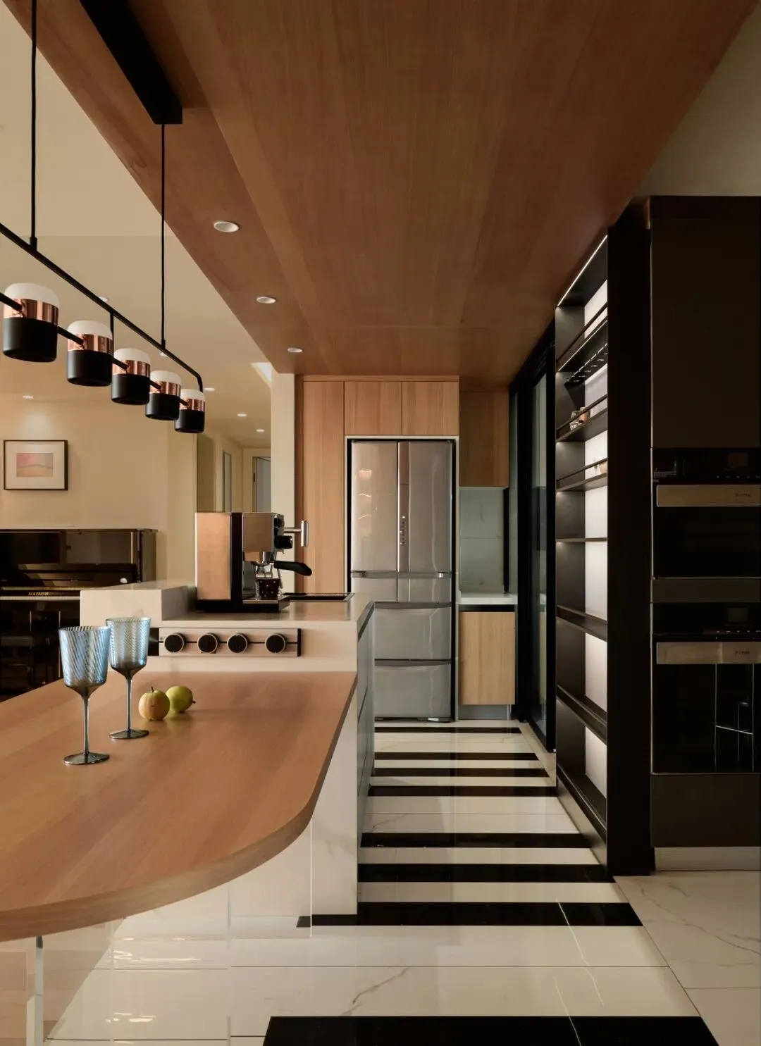 为了将钢琴元素更好地融入家中,设计师脑洞大开,利用瓷砖切割成钢琴黑白键,放大比例, 作为餐厨地面的铺贴元素。