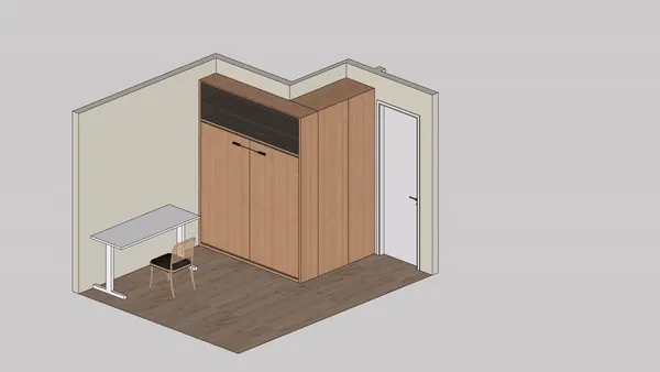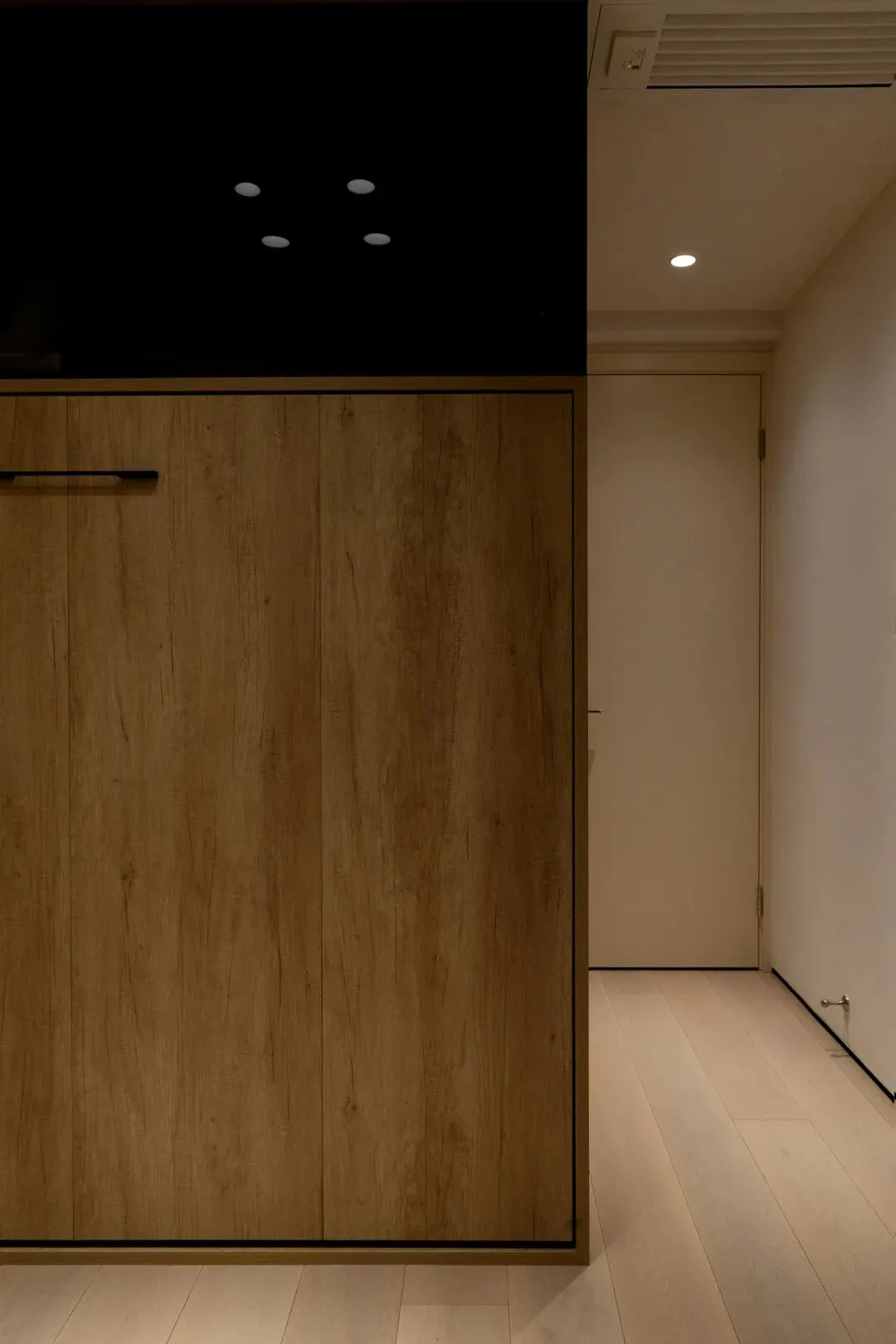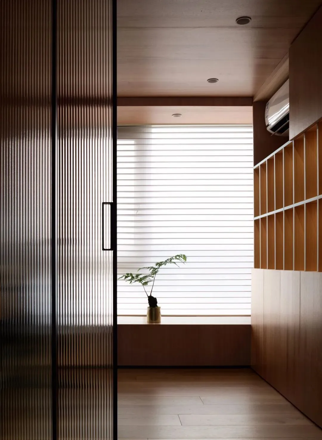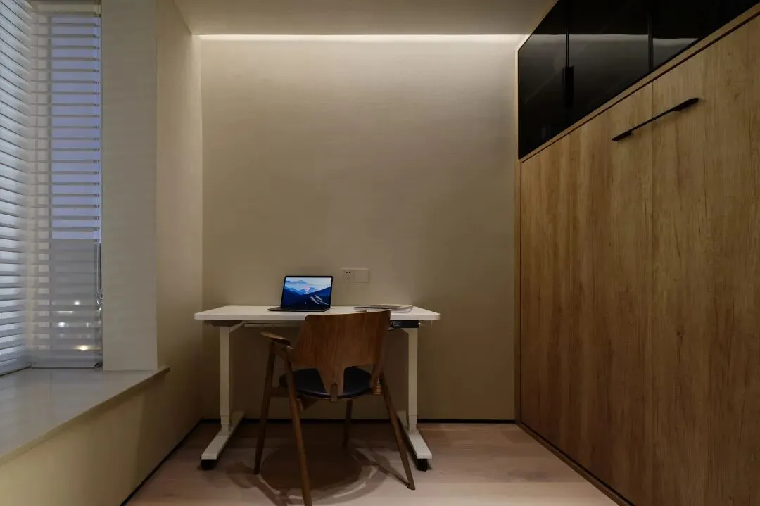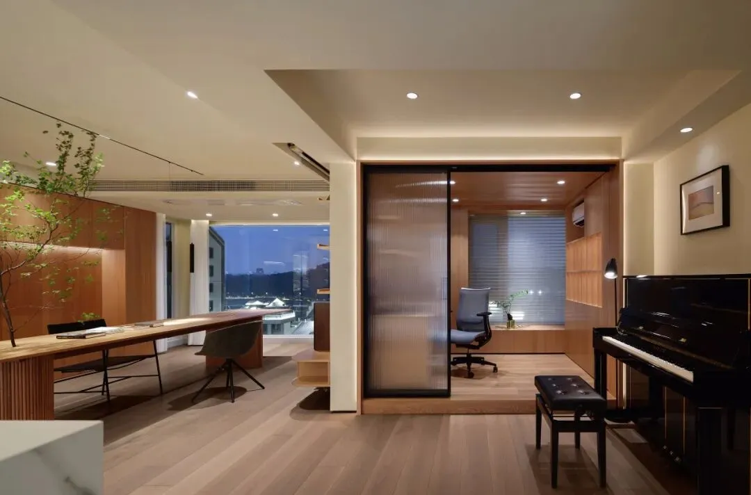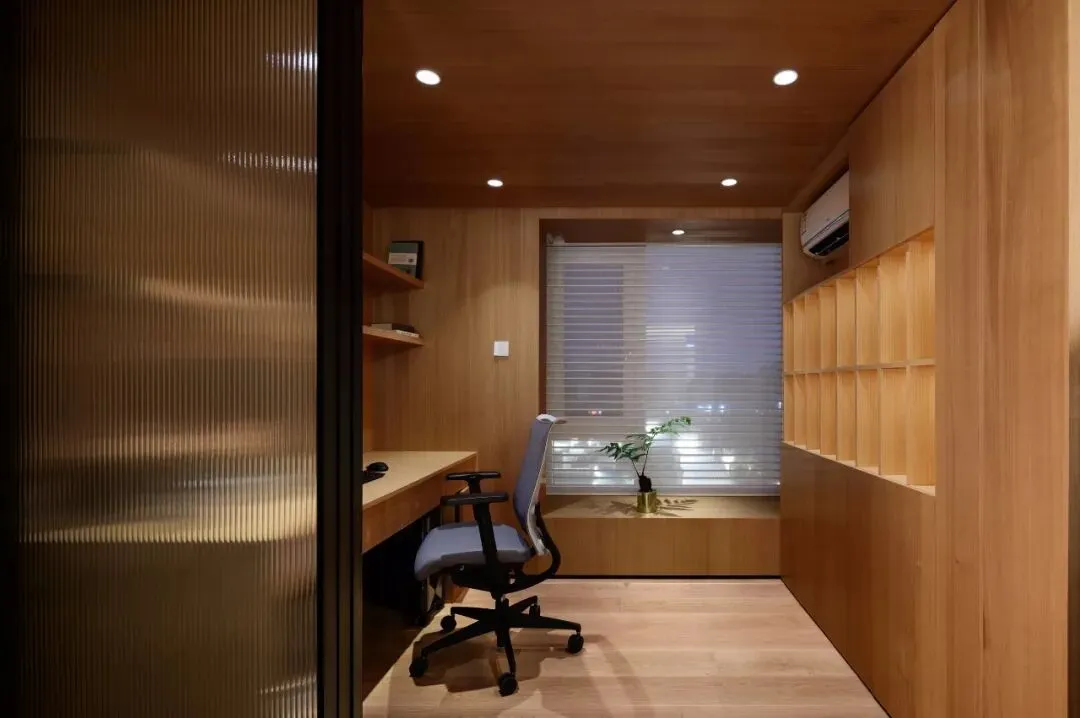 另一半则是公区的书房,男屋主的办公区,设计师利用木盒子的概念将书房嵌入客厅,可开可合,疲倦时还可以坐在飘窗上欣赏窗外的江景。