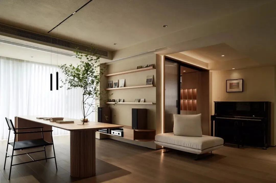 当去客厅化的设计被越来越多的人所接纳,没有沙发、电视的客厅,仅凭一张大长桌就实现了家庭社交的方式。
