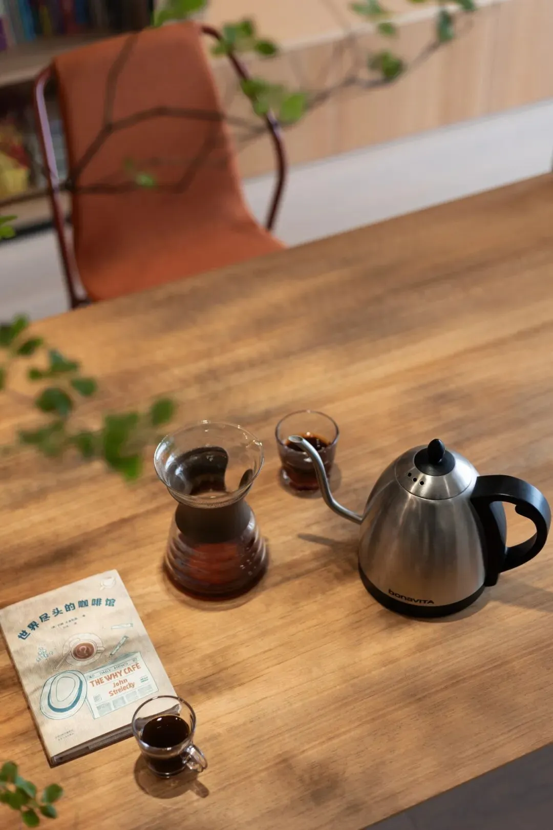 为了营造树下阅读的自然体验感,设计师为长桌增加绿植,并将花瓶隐藏在了桌腿柱里面,避免屋主在阅读时不小心碰倒。