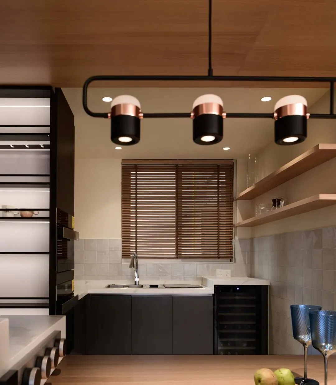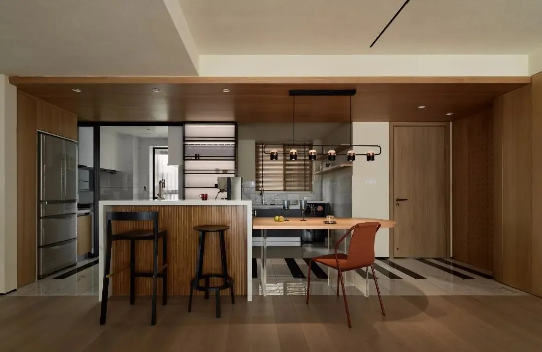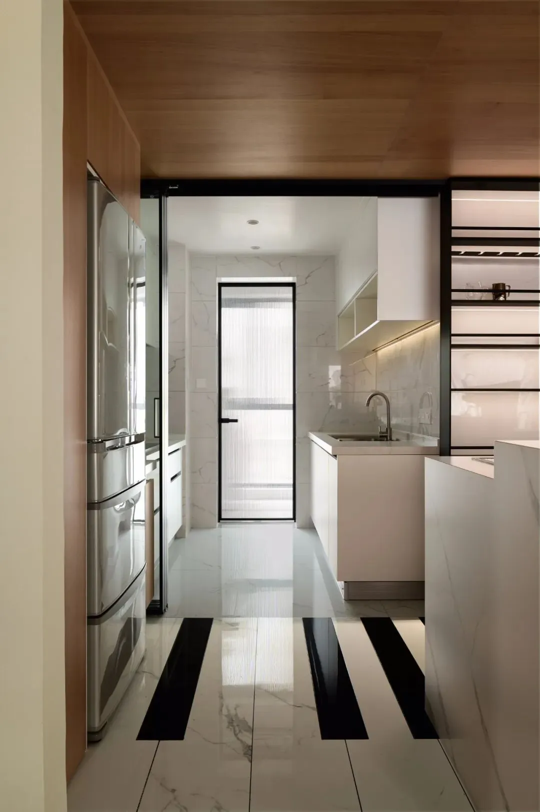 防止中式爆炒时油烟乱窜,设计师在中厨和岛台之间,增加了联动玻璃门。